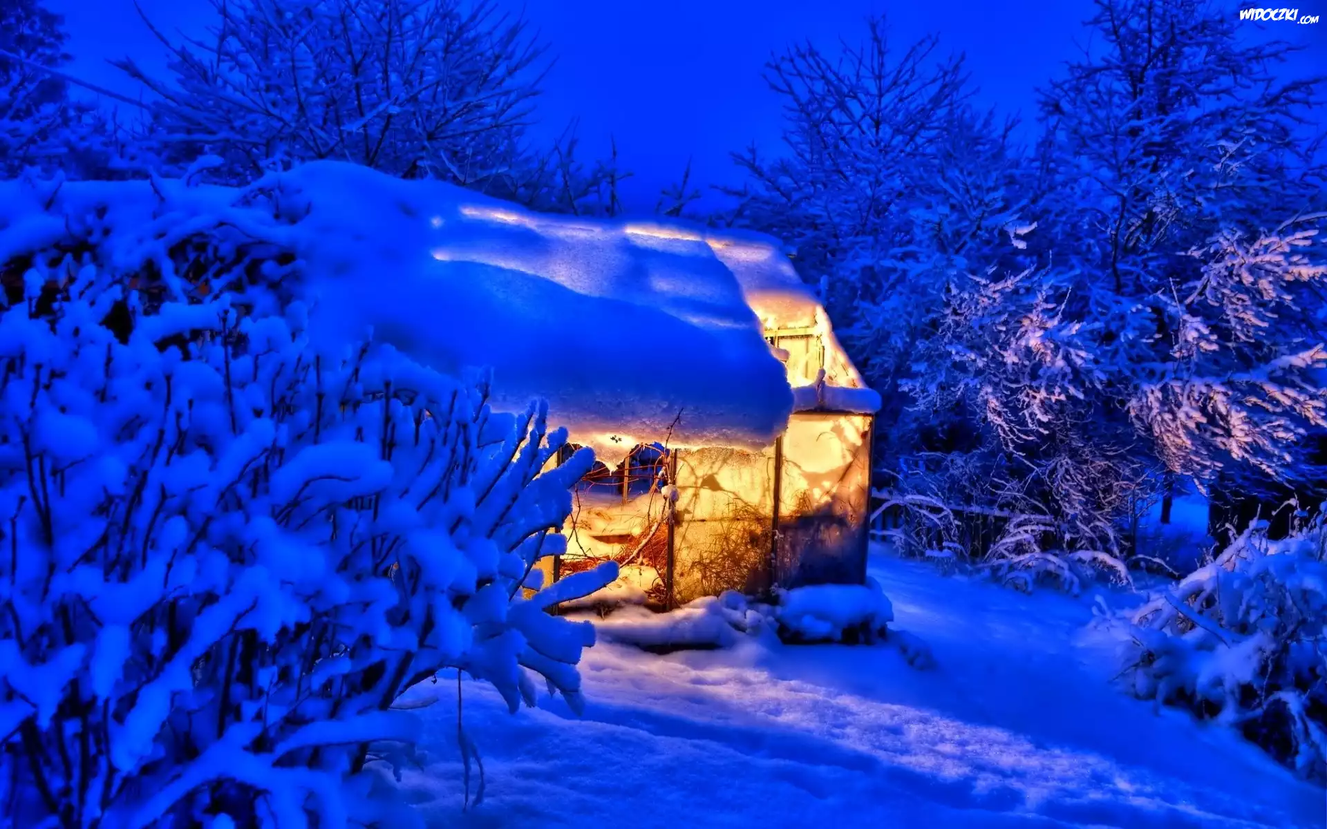 Góra, Oświetlona, Szopa, Drzewa, Zima