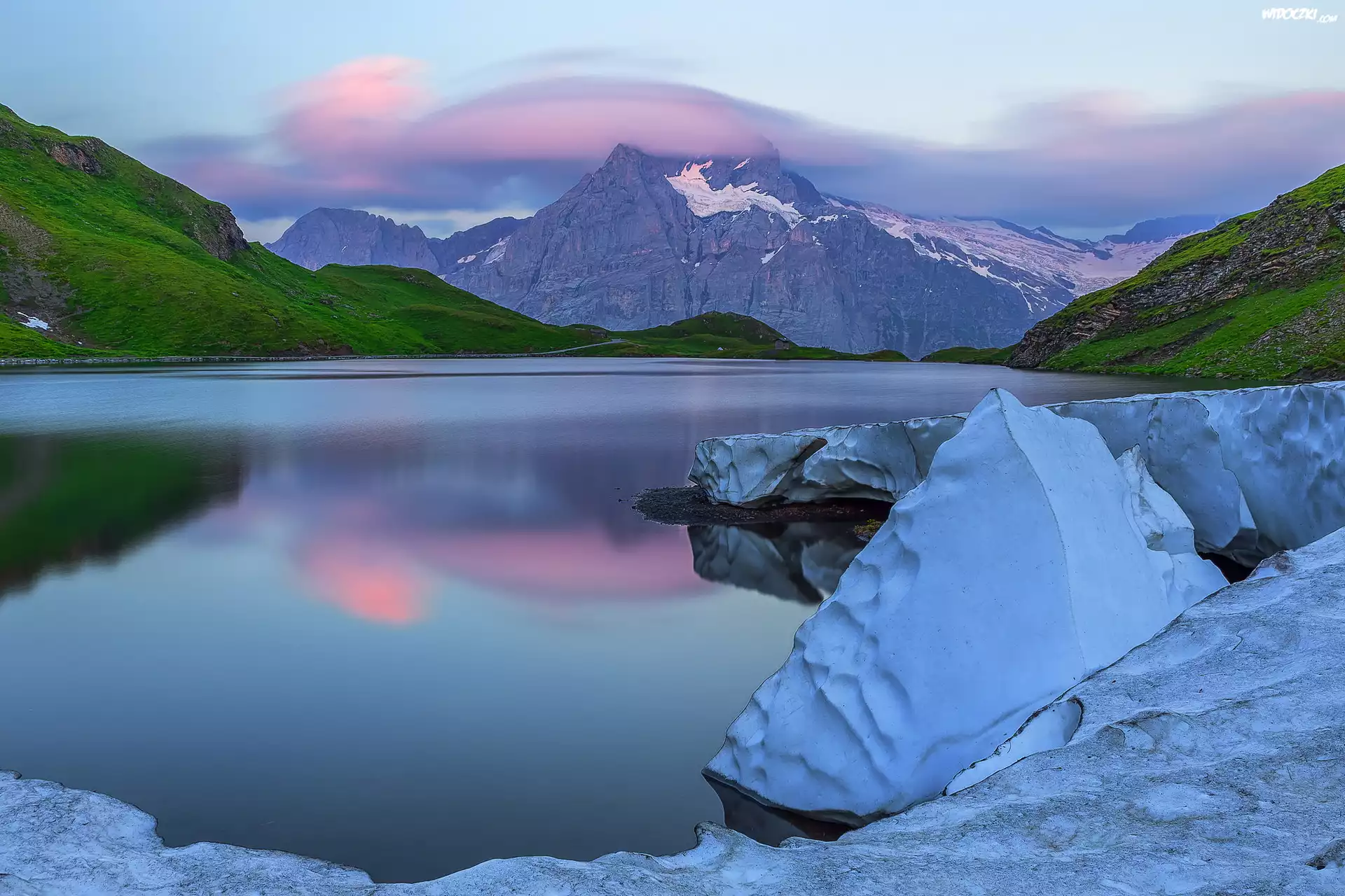Zdjęcia, Jezioro Bachsee, Góry, Alpy Berneńskie, Góra Wetterhorn, Zima, Śnieg, Kanton Berno, Szwajcaria