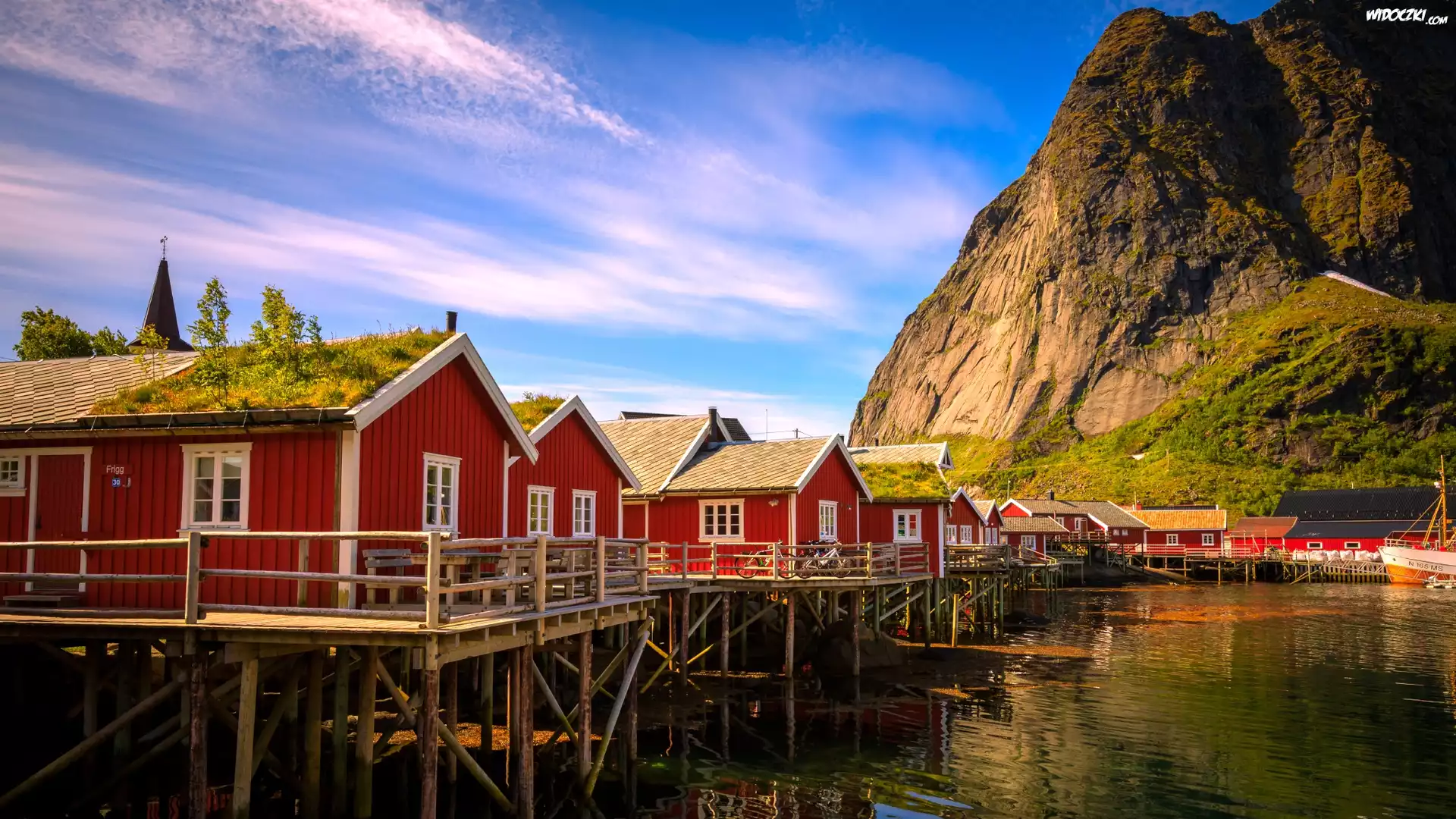 Norwegia, Reine, Lofoty, Góra, Morze, Domy, Czerwone