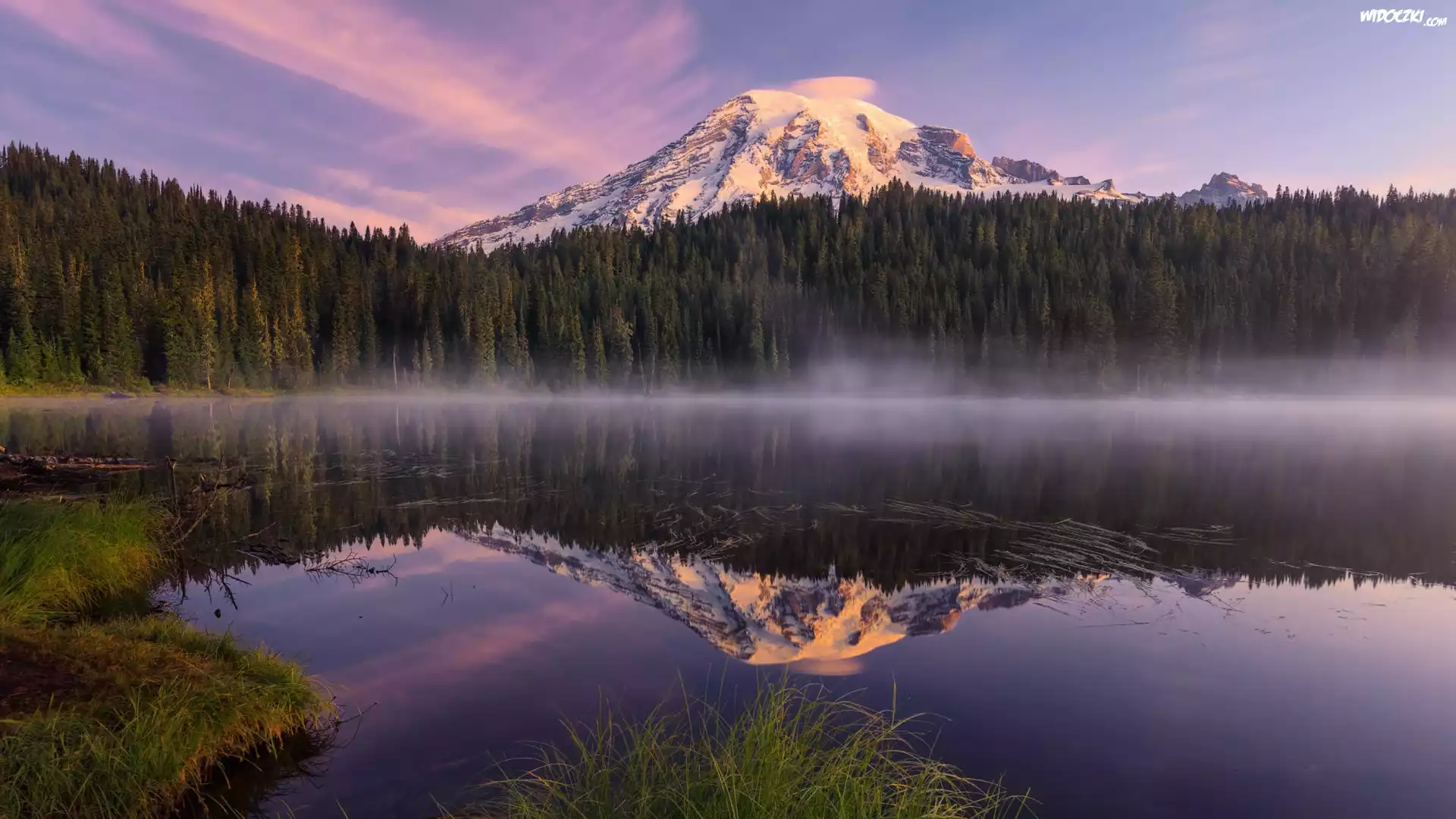 Góra, Stratowulkan Munt Rainier, Park Narodowy Mount Rainier, Drzewa, Las, Mgła, Odbicie, Jezioro, Bench Lake, Stan Waszyngton, Stany Zjednoczone |