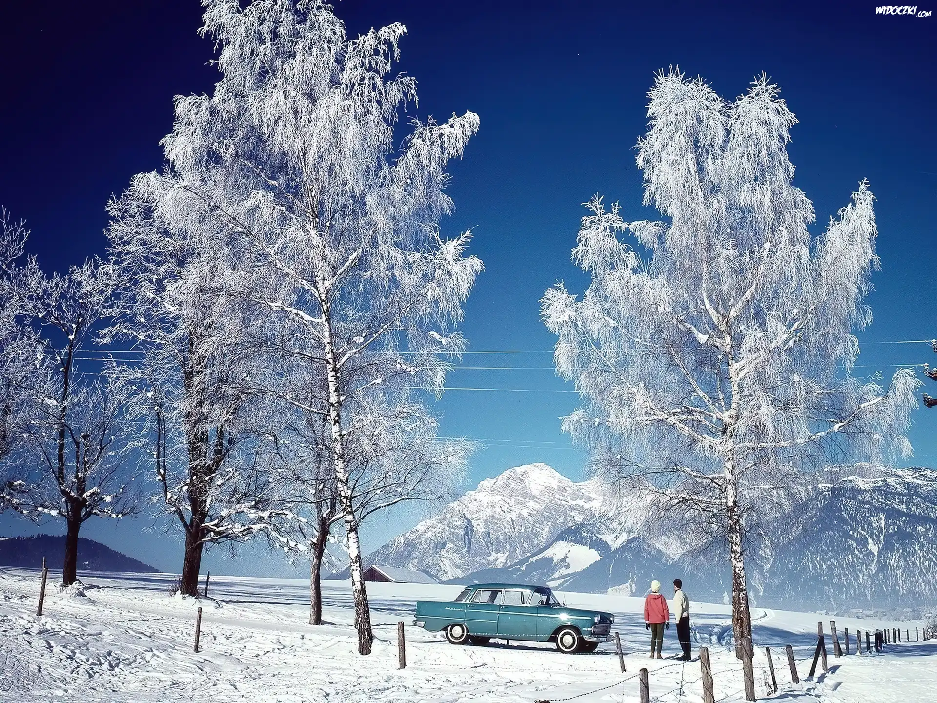 Zdjęcia, Góra, Ośnieżone, Drzewa, Samochód, Ludzie