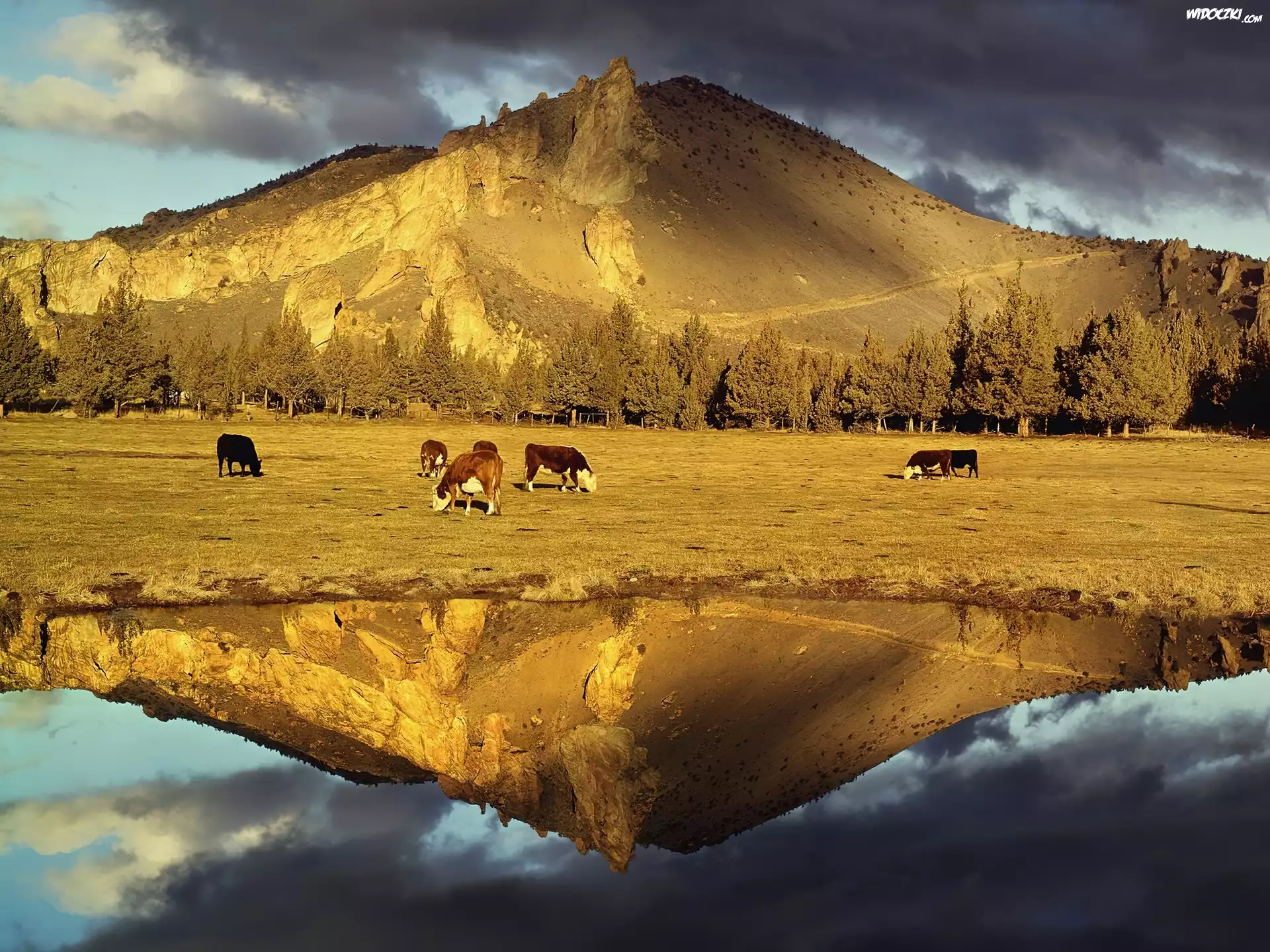 Góra, Pastwisko, Krowy, Woda, Odbicie
