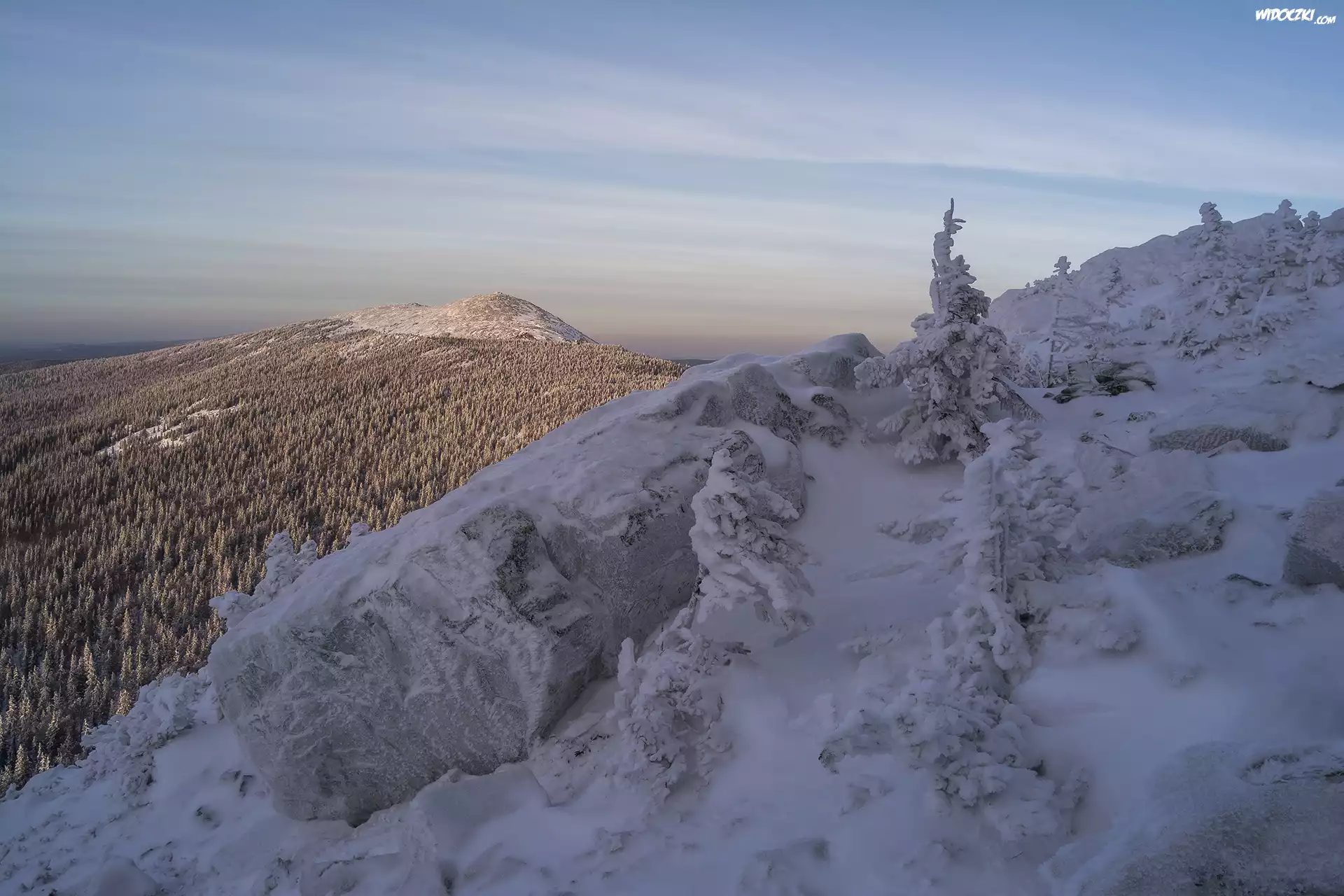 Wzgórze, Kamienie, Góra, Drzewa, Zima, Park Narodowy Taganaj, Obwód czelabiński, Rosja