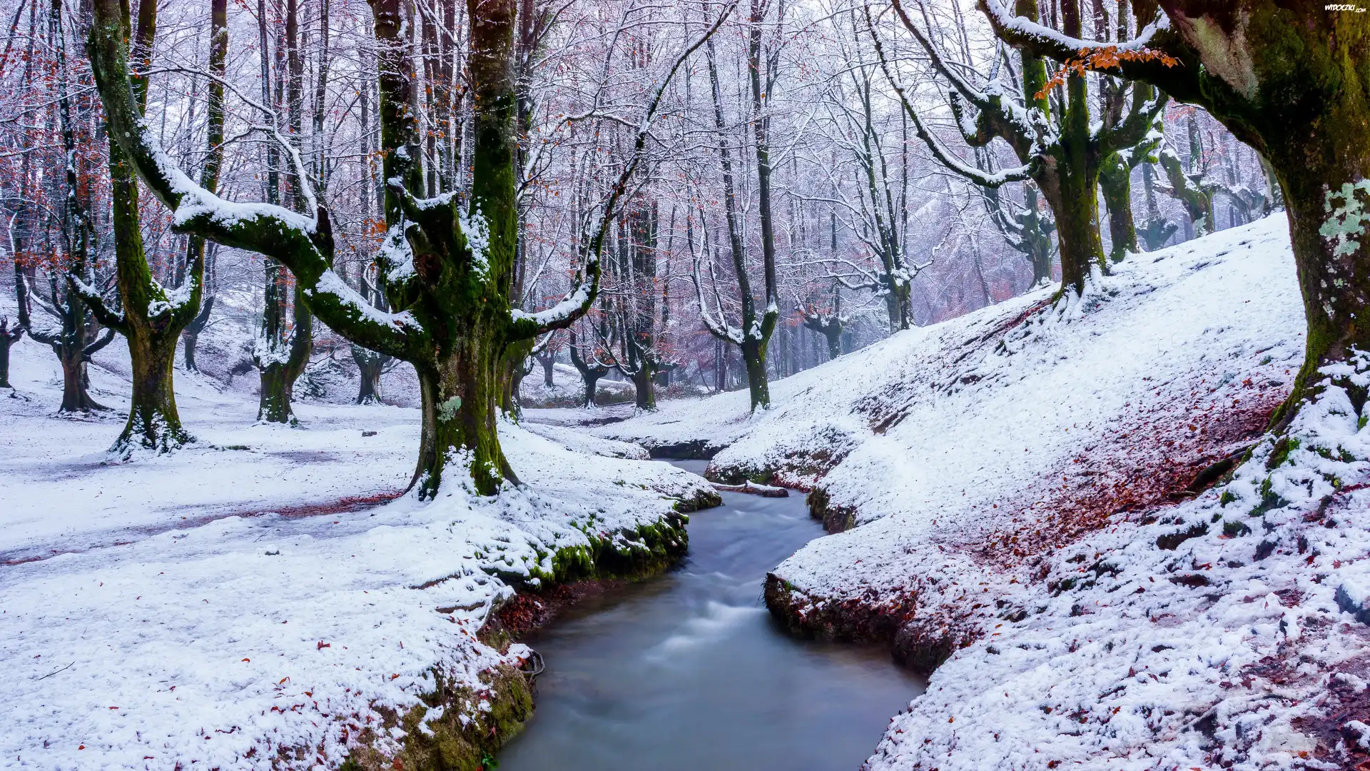 Zdjęcia, Park Narodowy Gorbea, Zima, Drzewa, Las, Rzeczka, Strumyk, Kraj Basków, Hiszpania