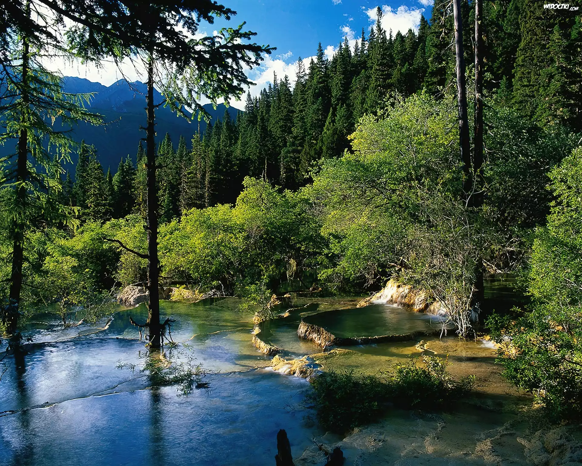 Góra, Wodospady, Morze Czerwone, Domki, Wąska, Rzeczka Góra, Skały Drzewo, Las Rzeka, Śnieg, Góry Góra Zielone, Lasy, Rozległe, Jeziora, Chmurki Rzeka Jesień, Las, Kamyki Góra, Jeziora Góra, Zima Rzeka, Mostek, Park Las, Ścieżka Las, Chmury