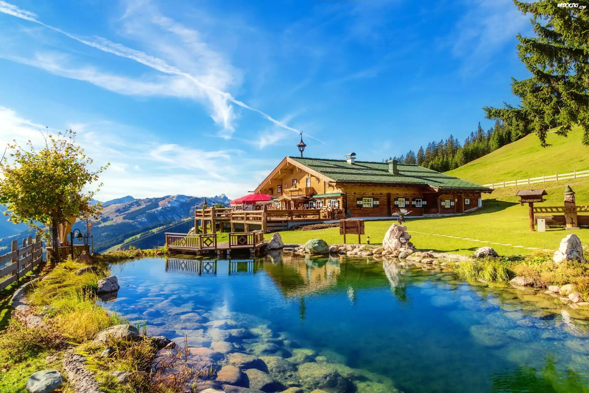 Zdjęcia, Górski dom, Staw, Krajobraz