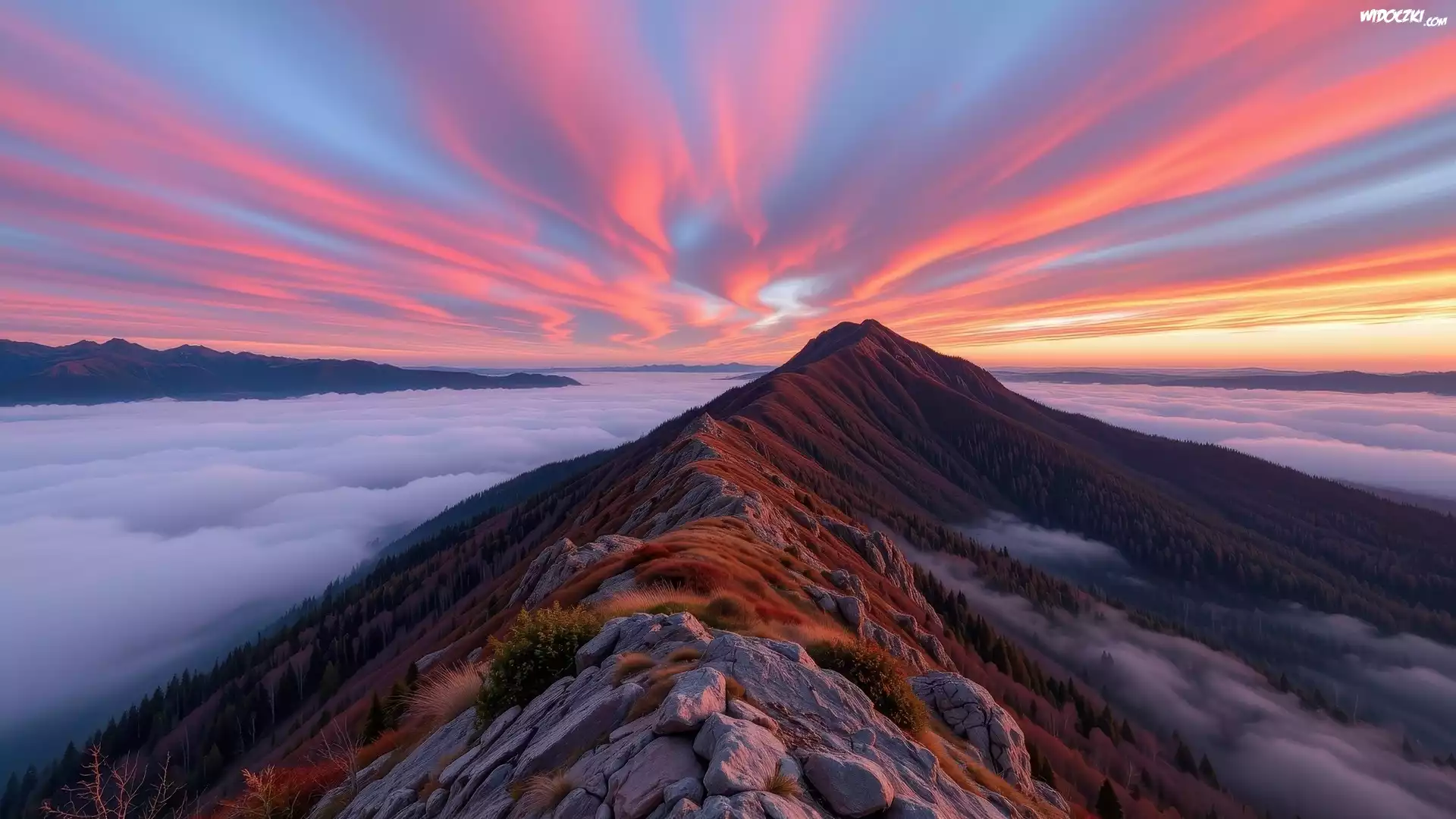 Kolorowe, Niebo, Wschód słońca, Opadająca, Mgła, Skały, Góra, Grzbiet górski, Grafika AI