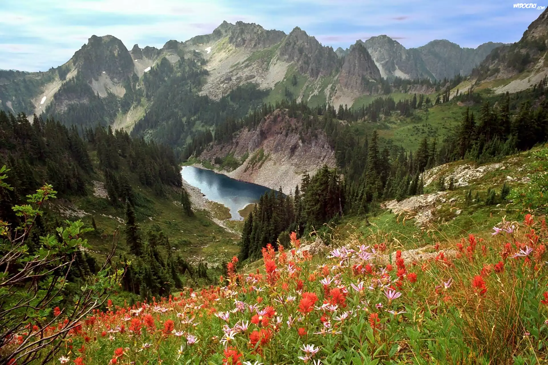 Zdjęcia, Górskie, Jezioro, Lasy, Łąka