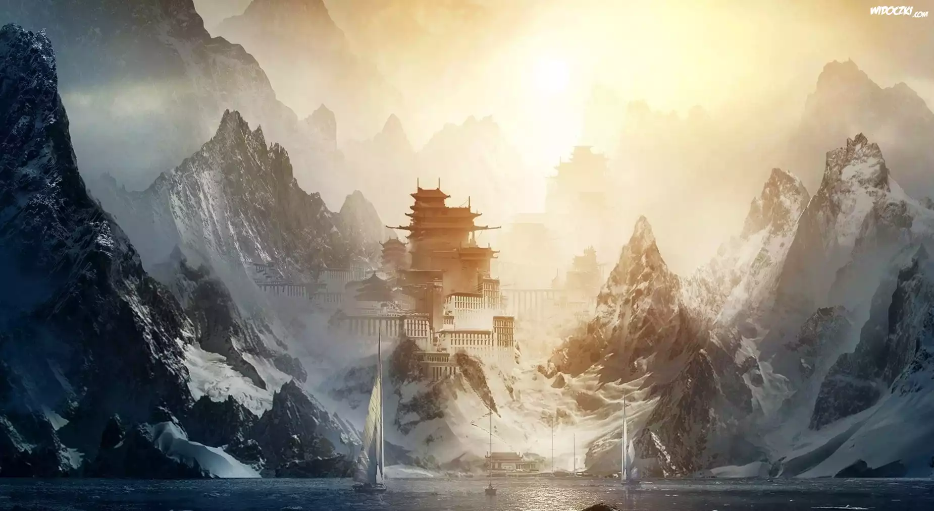 Góry, Morze, Żaglówki, Budowle, Wschód słońca
