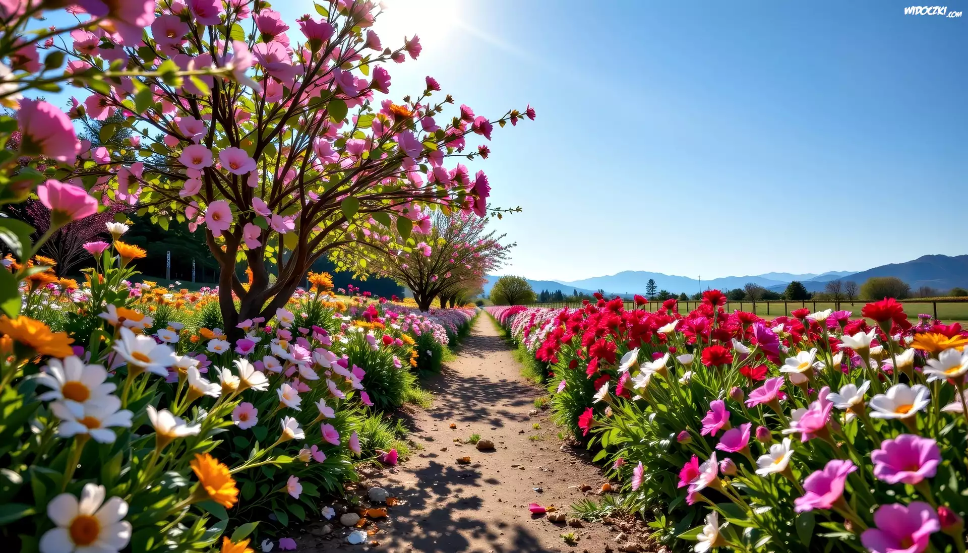 Ścieżka, Kwiaty, Drzewa, Góry, Grafika AI
