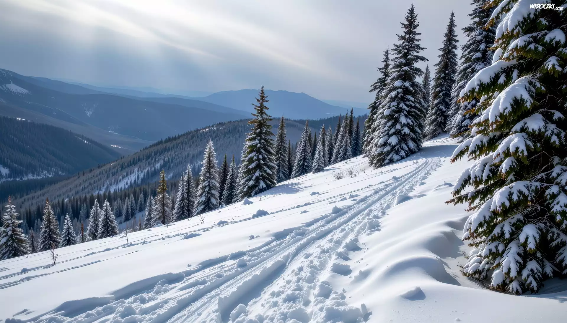 Zdjęcia, Zima, Zbocze, Drzewa, Góry, Grafika AI