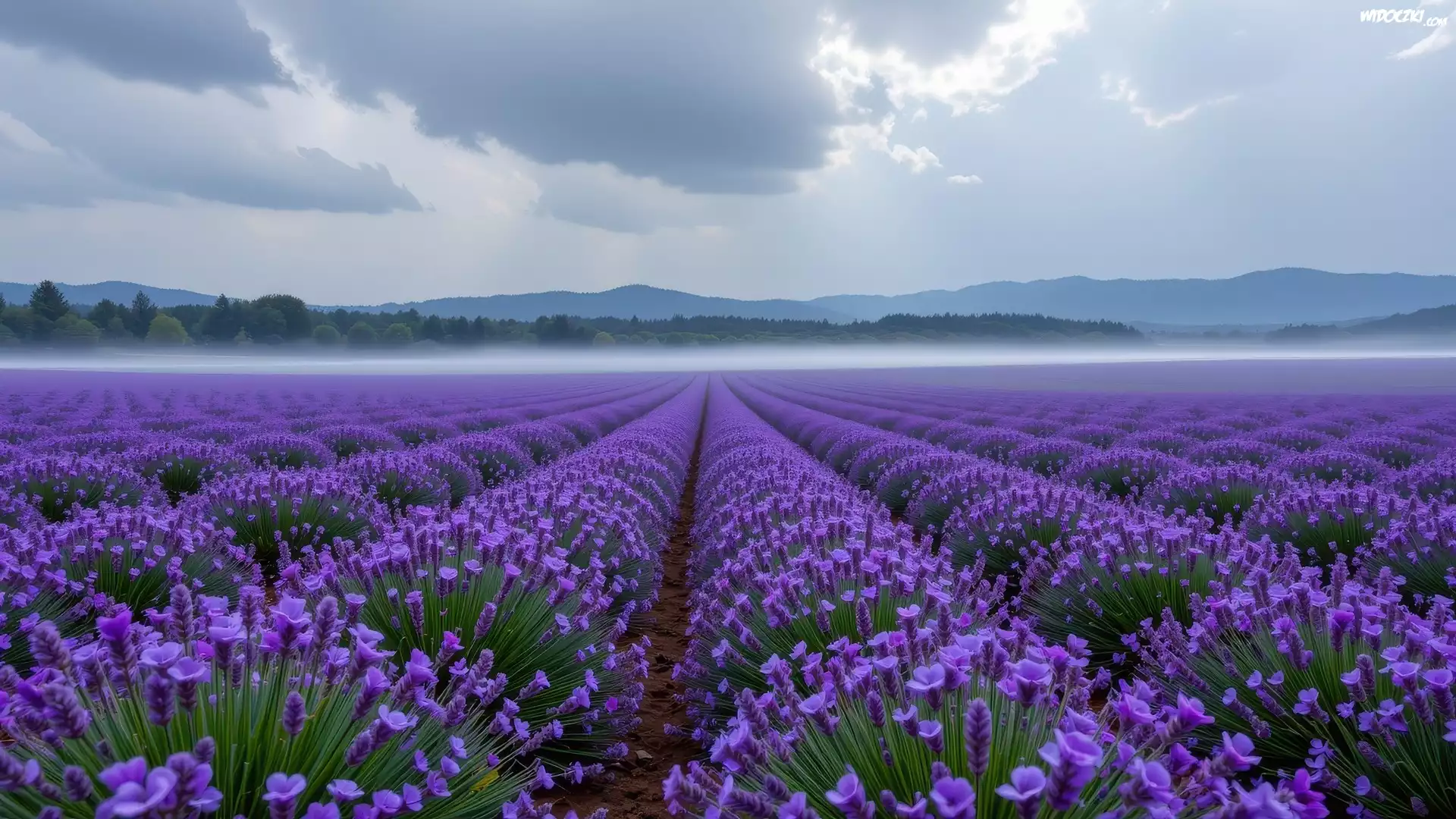 Lawenda, Pole, Mgła, Góry, Drzewa, AI