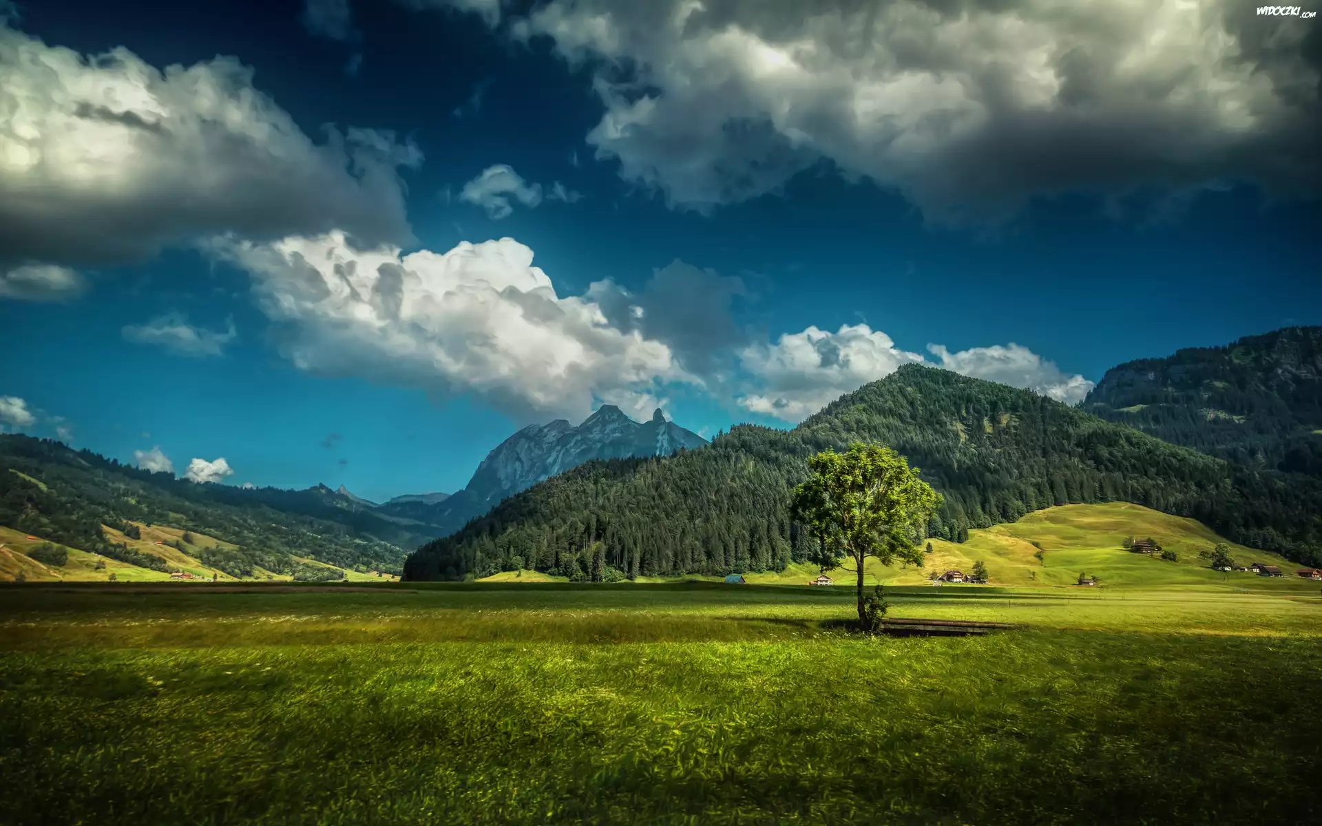 Góry, Lasy, Chmury, Domki, Łąka, Drzewo