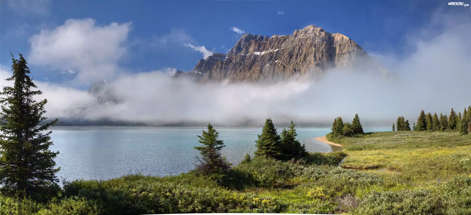 Zdjęcia, Góry, Jezioro, Łąka, Mgła