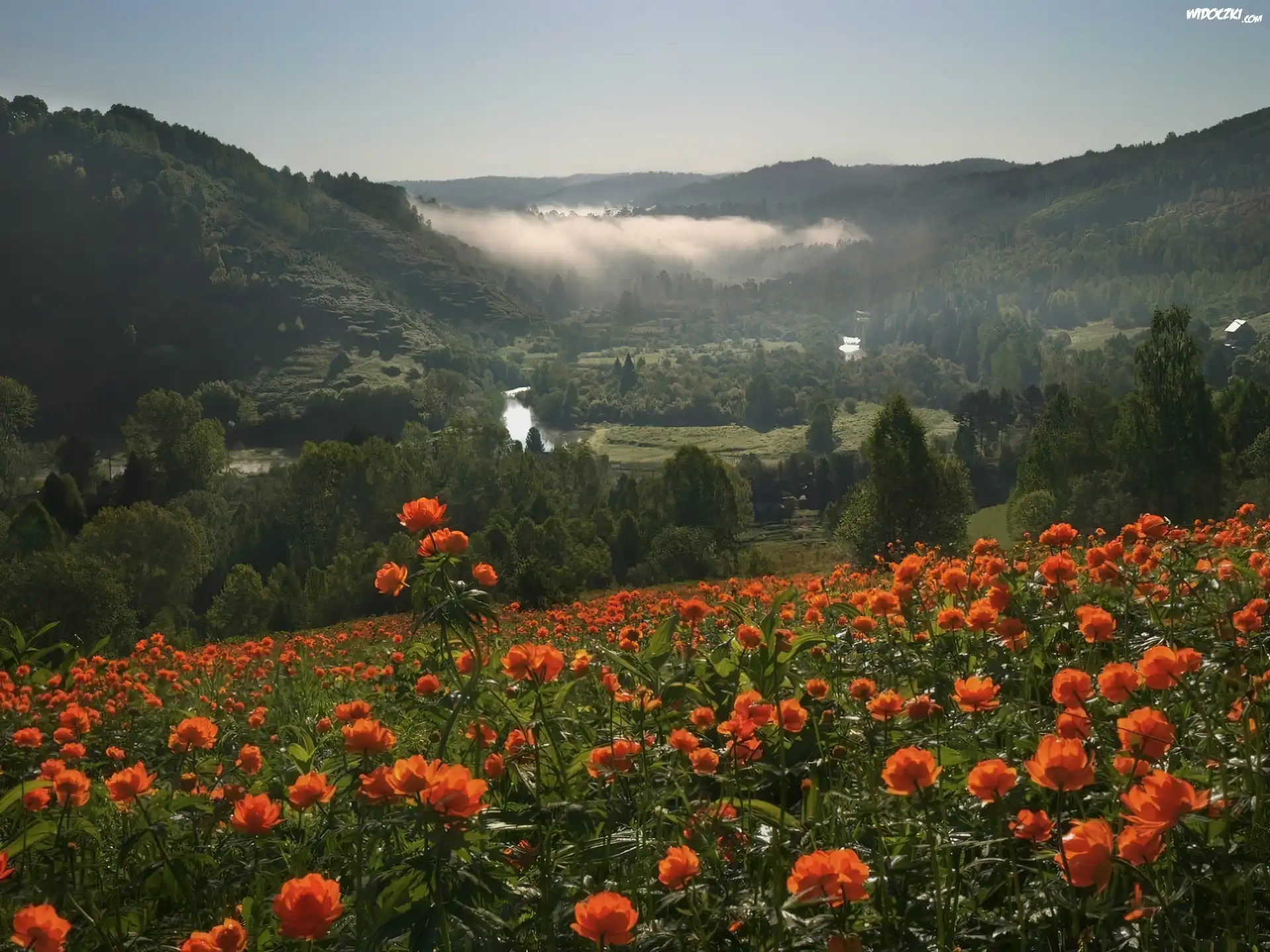 Zdjęcia, Góry, Rzeka, Mgła, Łąka, Kwiaty