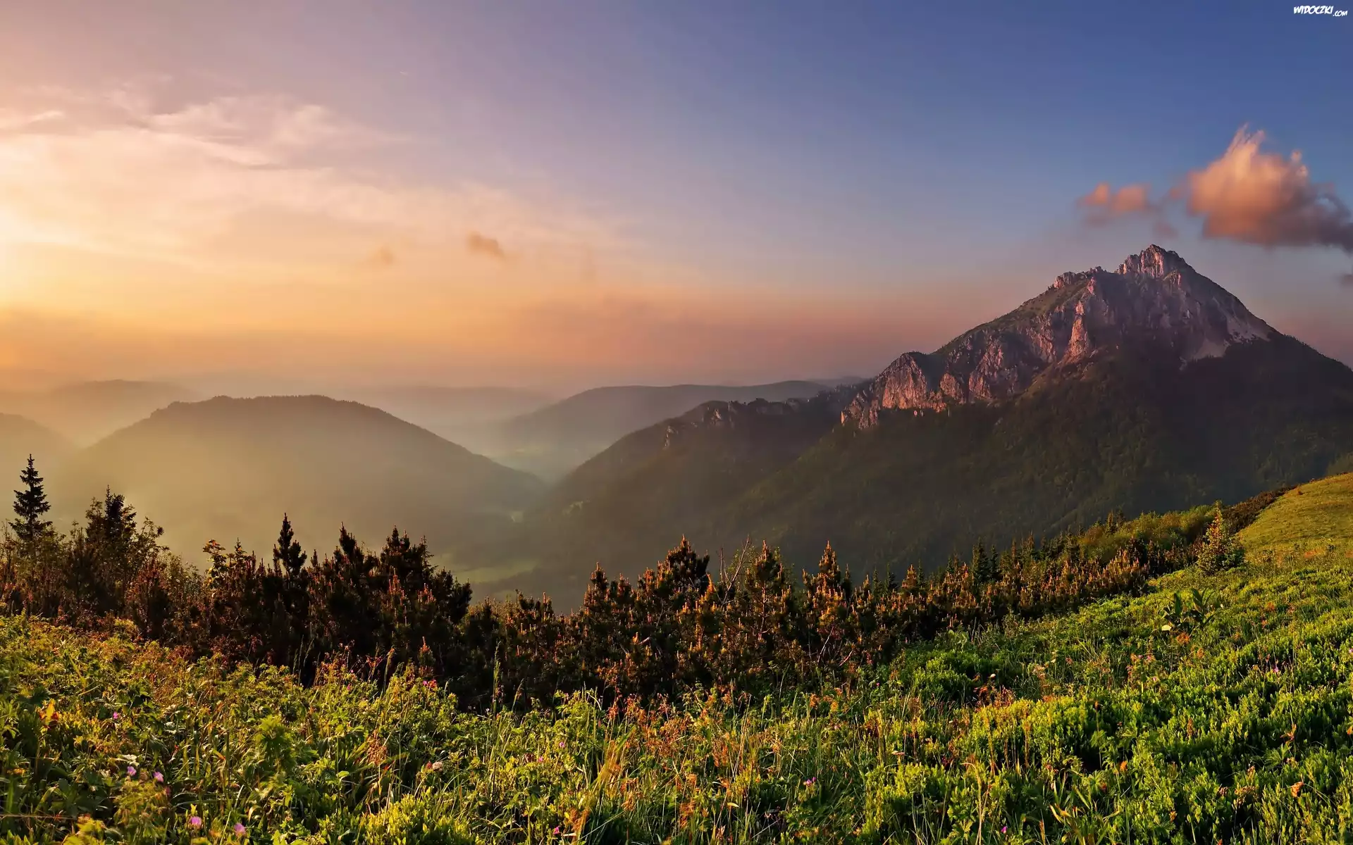 Zdjęcia, Góry, Mgła, Łąka, Świt