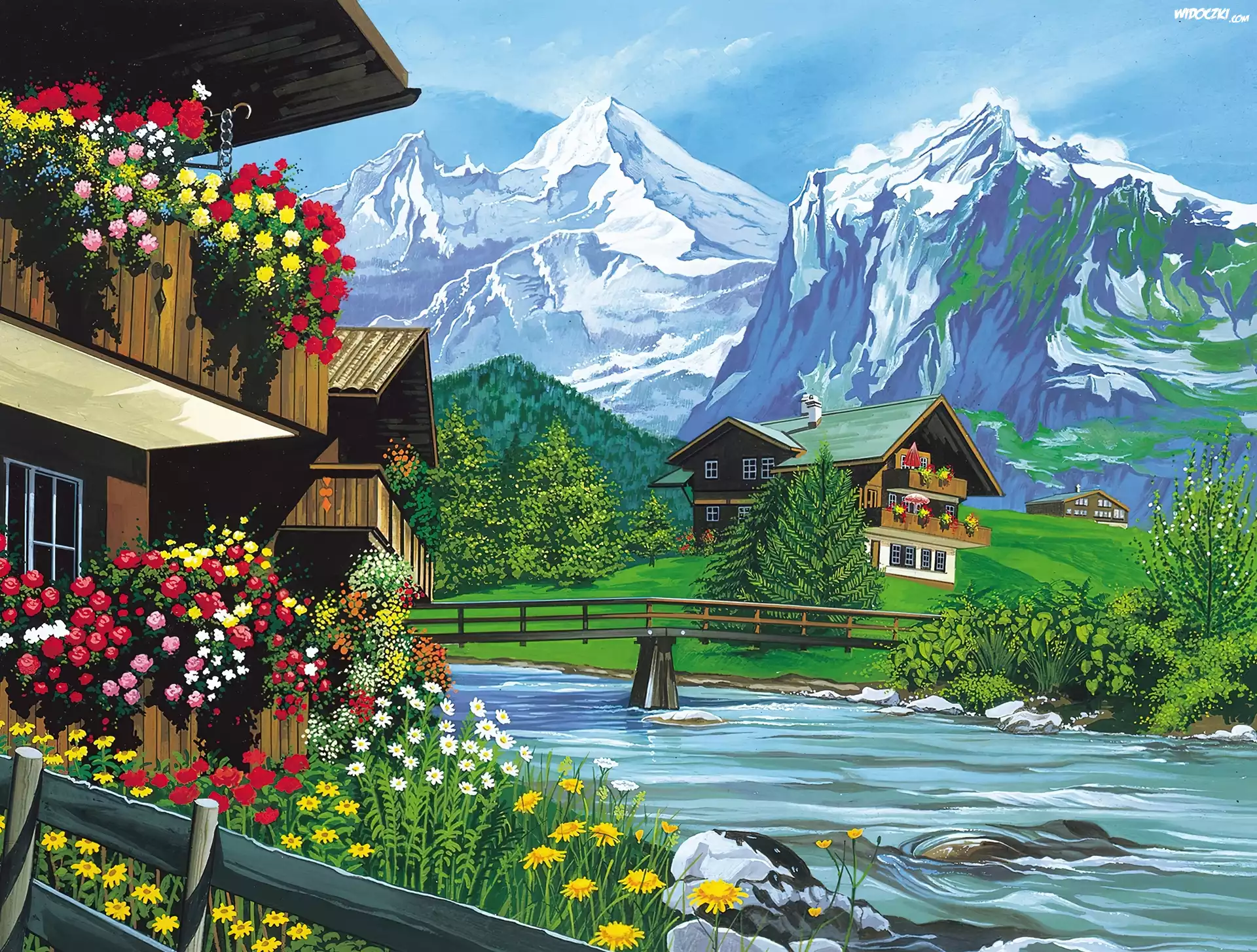 Góry, Domy, Most, Rzeka, Łąka, Kwiaty