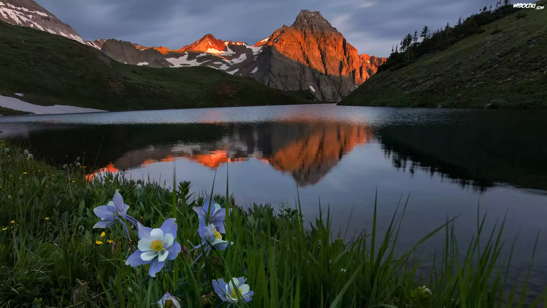 Góry, San Juan Mountains, Góra Sneffels, Jezioro, Blue Lake, Łąka, Kwiaty, Orlik niebieski, Stan Kolorado, Stany Zjednoczone |
