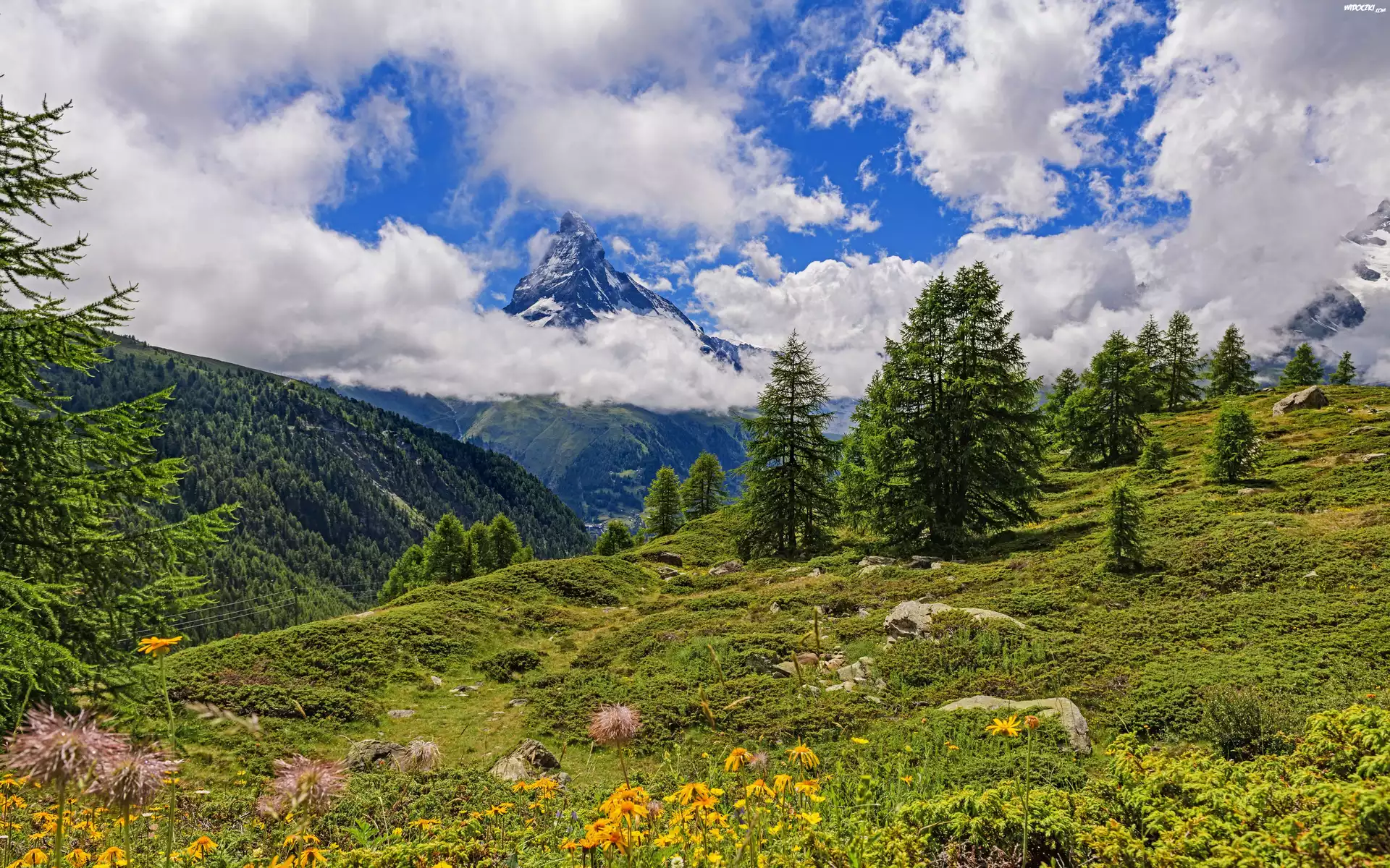 Zdjęcia, Góry, Szczyt, Świerki, Drzewa, Łąka, Chmury