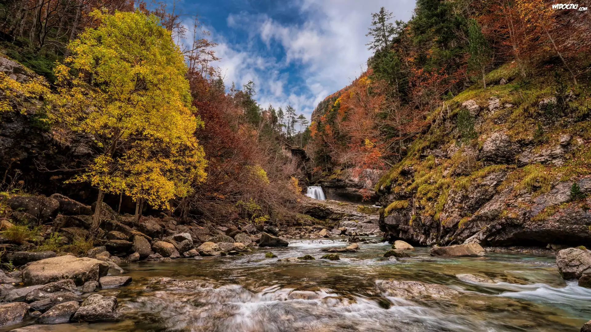 Góry, Rzeka, Kamienie, Skały, Drzewa, Park Narodowy Ordesa y Monte Perdido, Dolina Ordesa, Aragonia, Hiszpania |