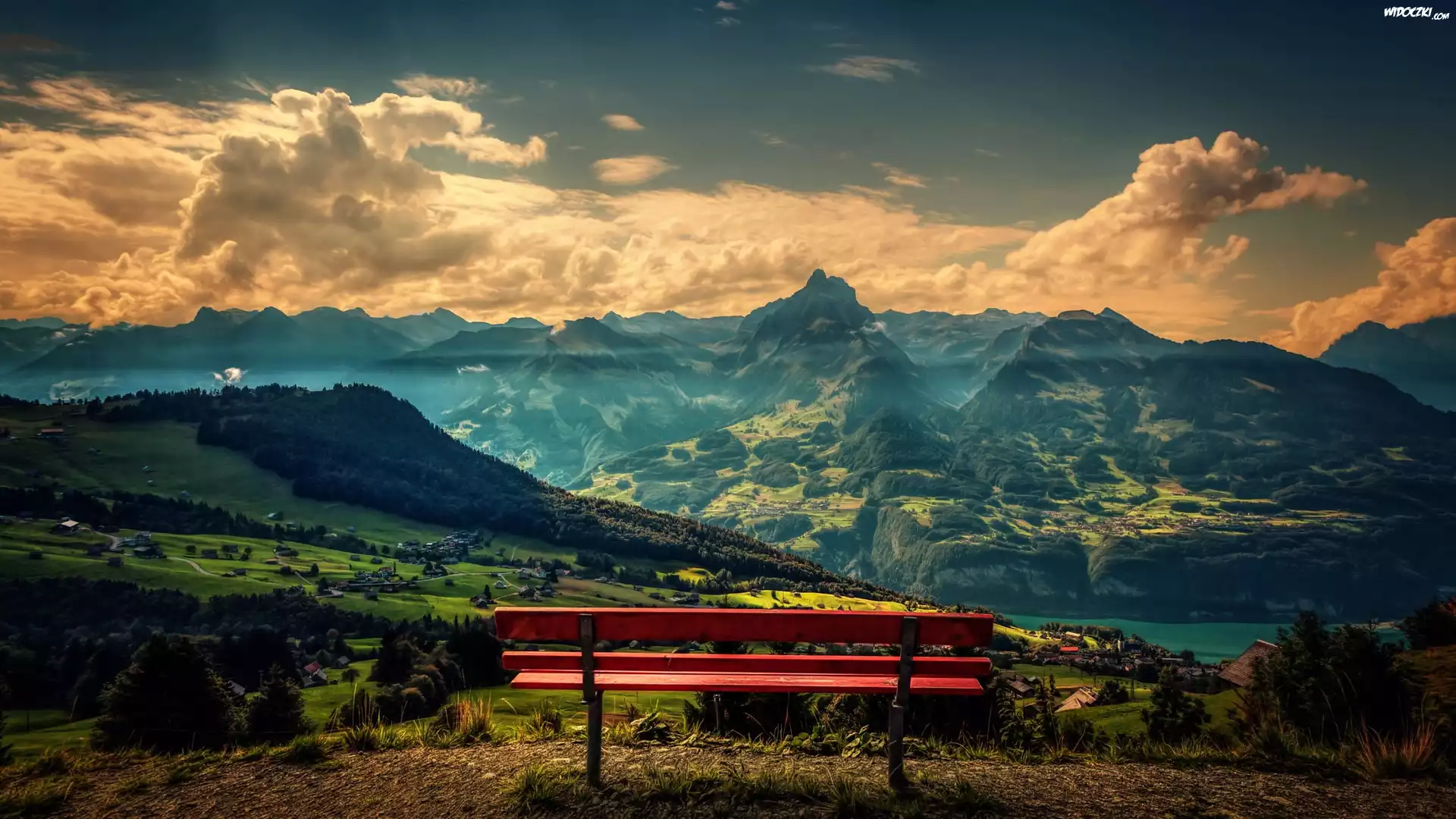 Zdjęcia, Góry, Pejzaż, Ławka, Ławeczka, Chmury