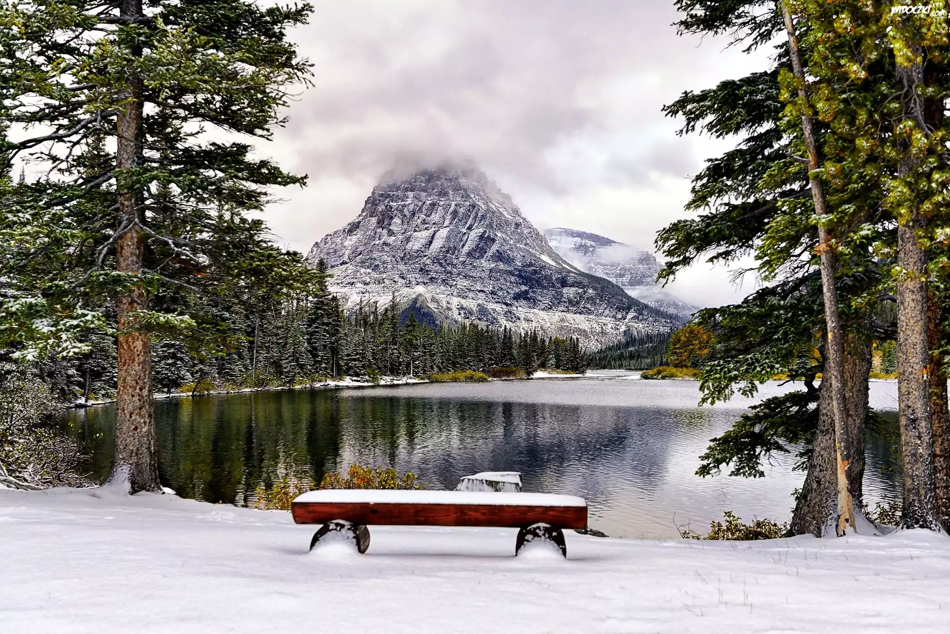 Zdjęcia, Góry, Jezioro, Ławka, Zima