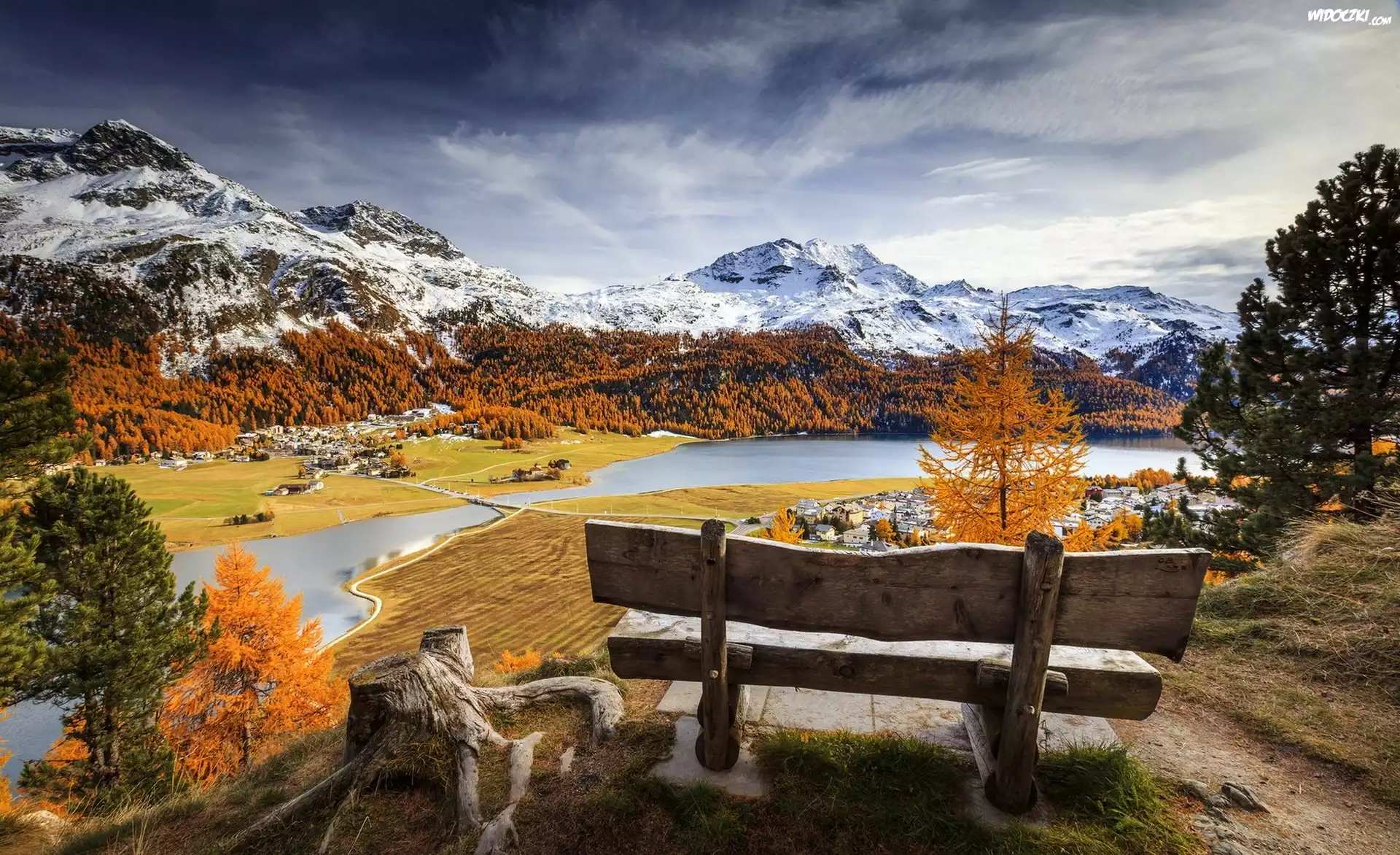 Zdjęcia, Góry, Jezioro, Lasy, Ławka, Krajobraz