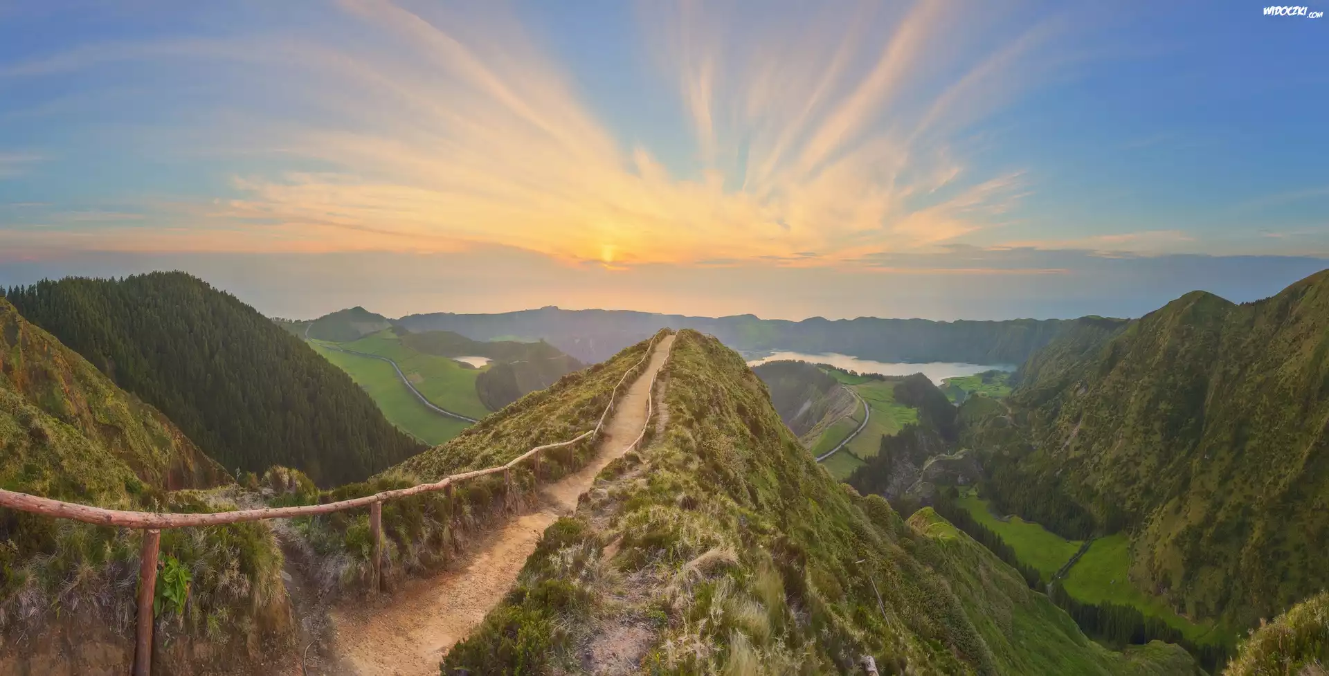 Góry, Ścieżka, Jeziora, Wschód słońca, Wyspa Sao Miguel, Wyspa Świętego Michała, Gmina Ponta Delgada, Azory, Portugalia |