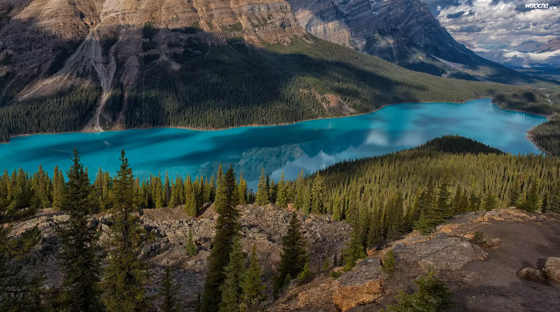 Zdjęcia, Góry, Skały, Drzewa, Jezioro, Peyto Lake, Park Narodowy Banff, Kanada