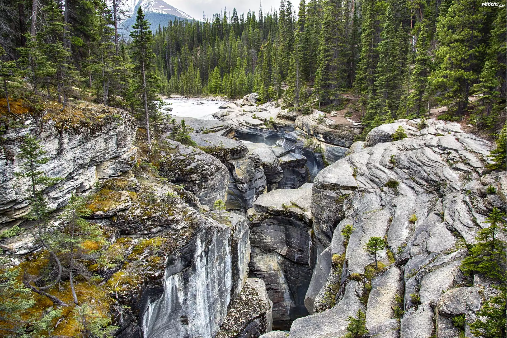Zdjęcia, Kanada, Prowincja Alberta, Park Narodowy Banff, Góry, Las, Mistaya Canyon, Rzeka
