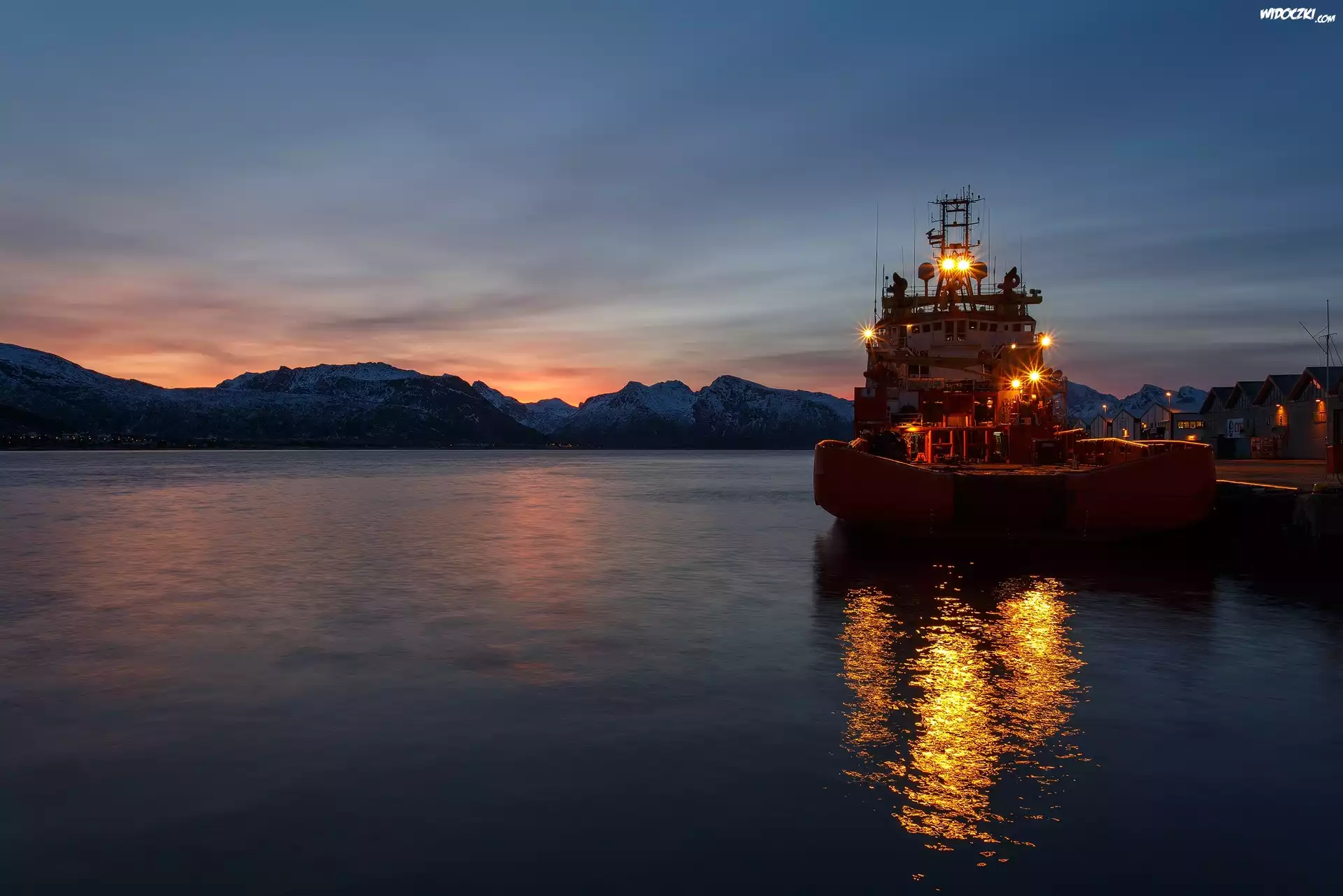 Zdjęcia, Góry, Jezioro, Barka, Światła