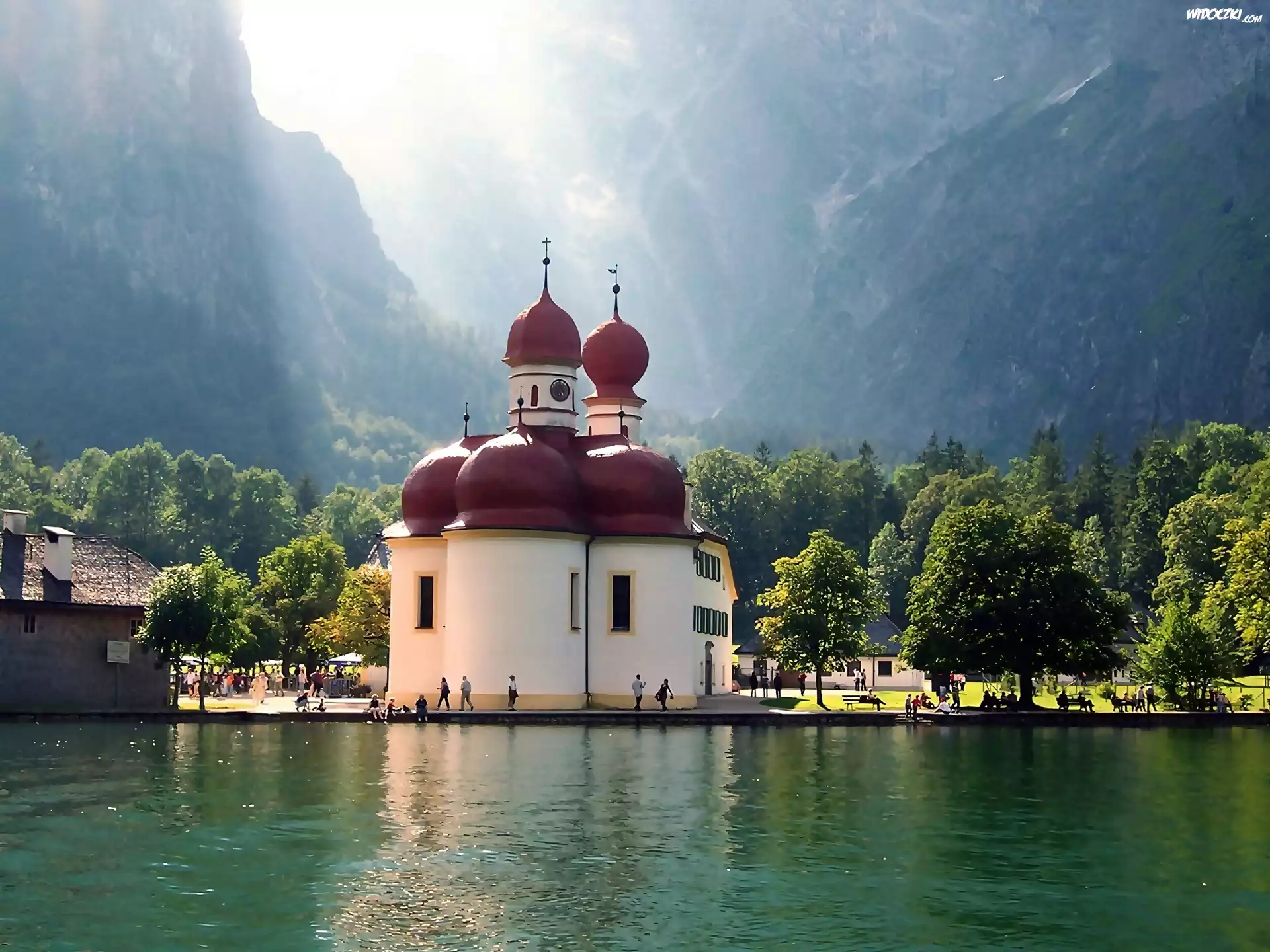 Bawaria, Góry, Jezioro, Koenigssee, Kościół, Budynek, Drzewa
