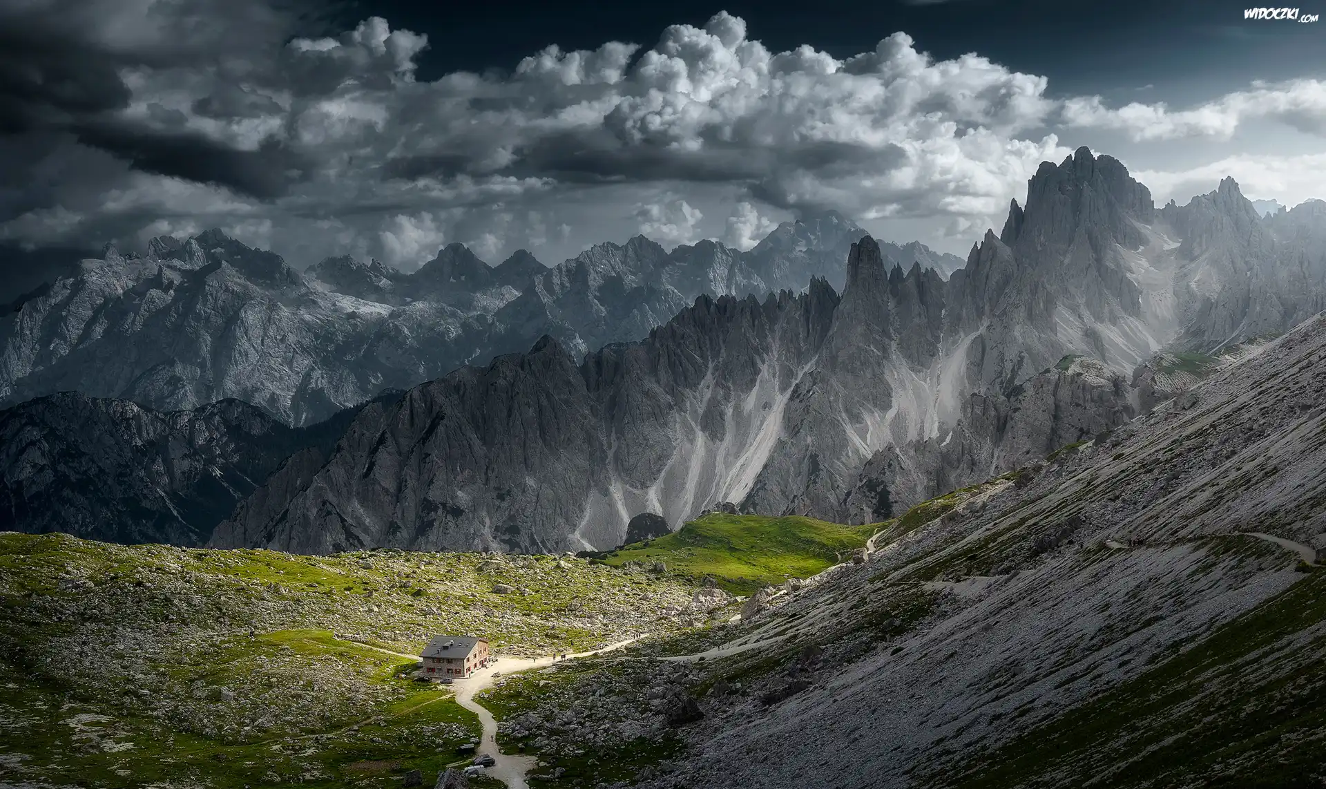 Góry, Dolomity, Masyw Cadini di Misurina, Chmury, Dom, Schronisko Citta di Capri, Droga, Prowincja Belluno, Włochy |