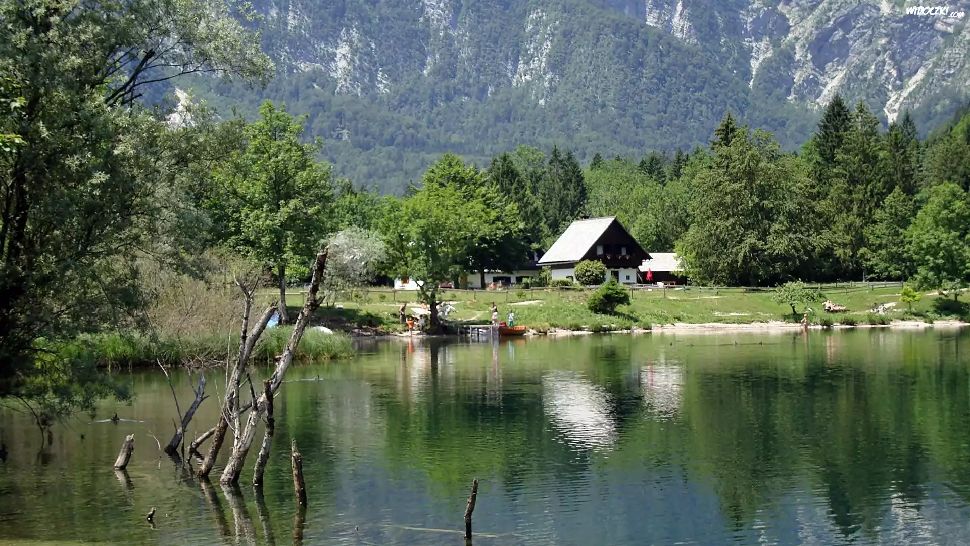 Zdjęcia, Góry, Lasy, Jezioro, Bohinj, Domy