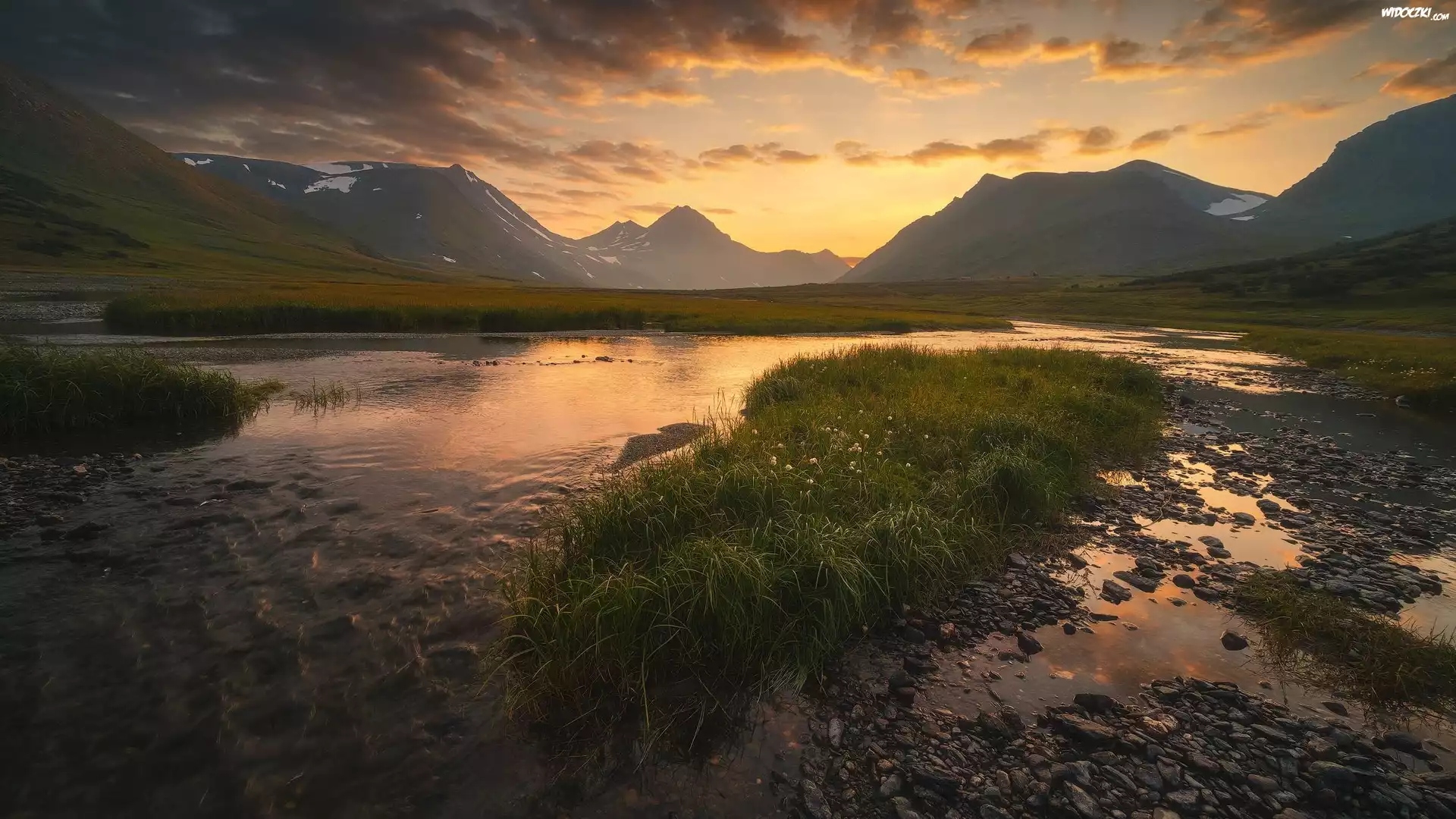 Góry, Ural, Rzeka Bolshaya Khadata, Zachód słońca, Kamienie, Trawa, Okręg Jamalsko-Nieniecki, Rosja |