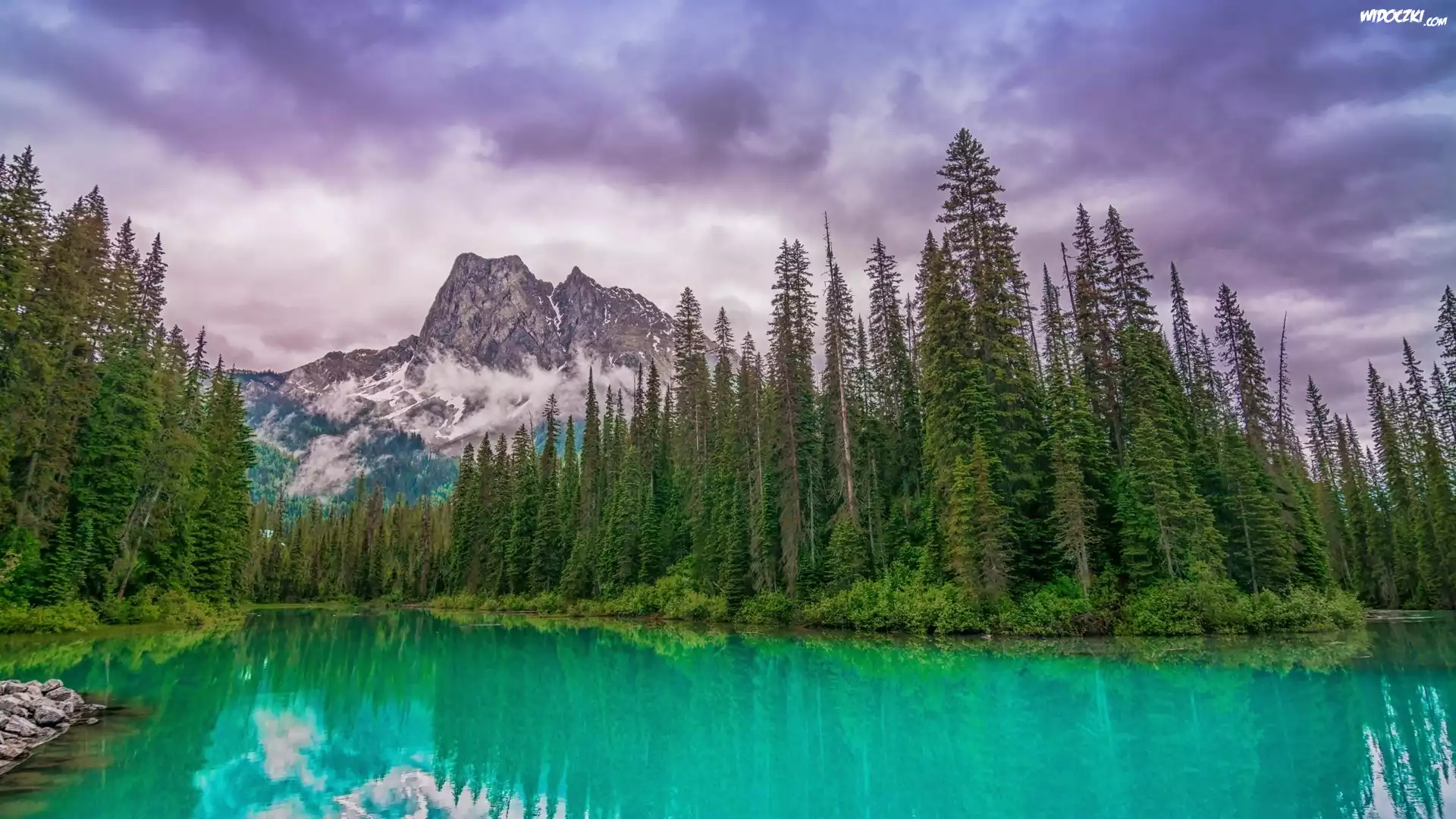 Góry, Canadian Rockies, Las, Drzewa, Jezioro, Emerald Lake, Park Narodowy Yoho, Chmury, Kolumbia Brytyjska, Kanada |