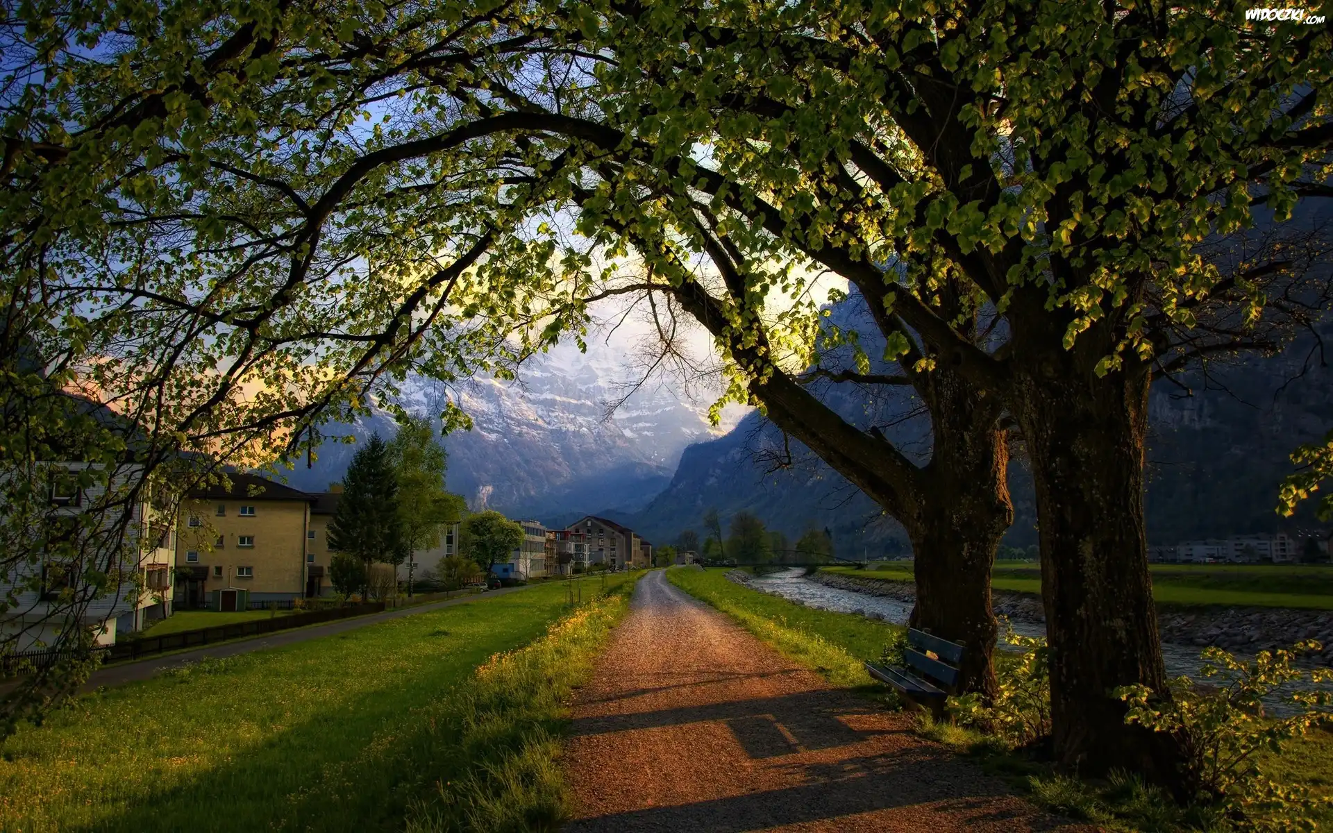 Zdjęcia, Góry, Droga, Budynki, Drzewa