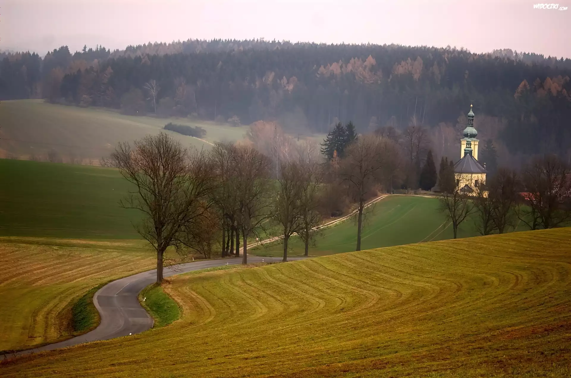 Zdjęcia, Góry, Droga, Drzewa, Pole, Budynki, Las
