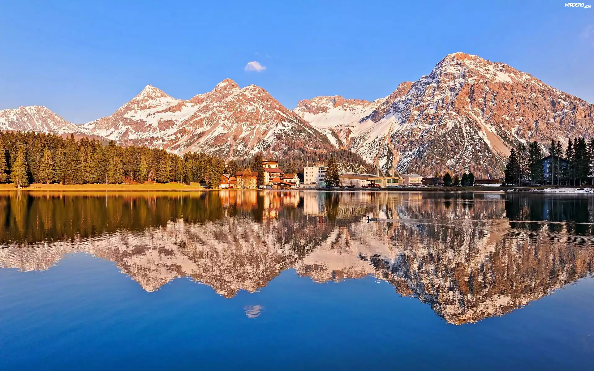 Zdjęcia, Góry, Jezioro, Las, Budynki, Odbicie