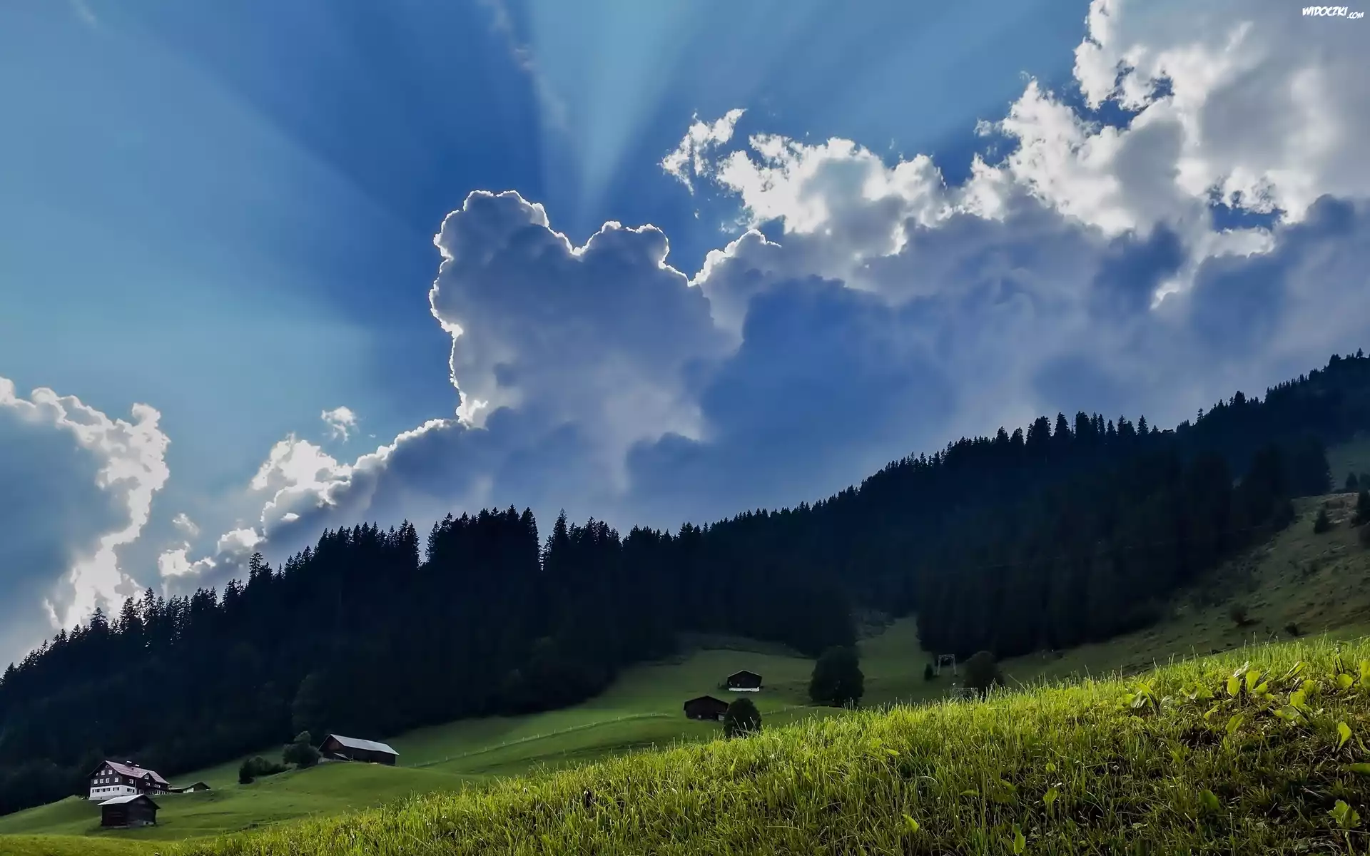 Zdjęcia, Góry, Lasy, Łąki, Domy, Chmury, Zmierzch