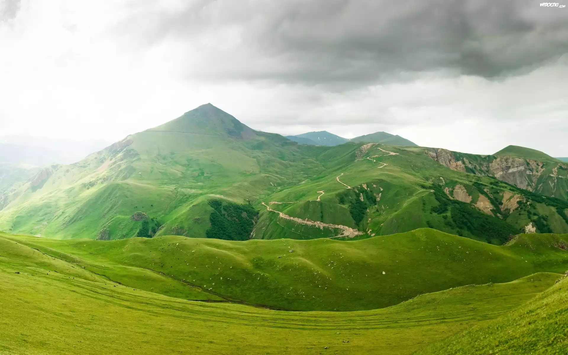 Zdjęcia, Góry, Łąki, Chmury, Droga