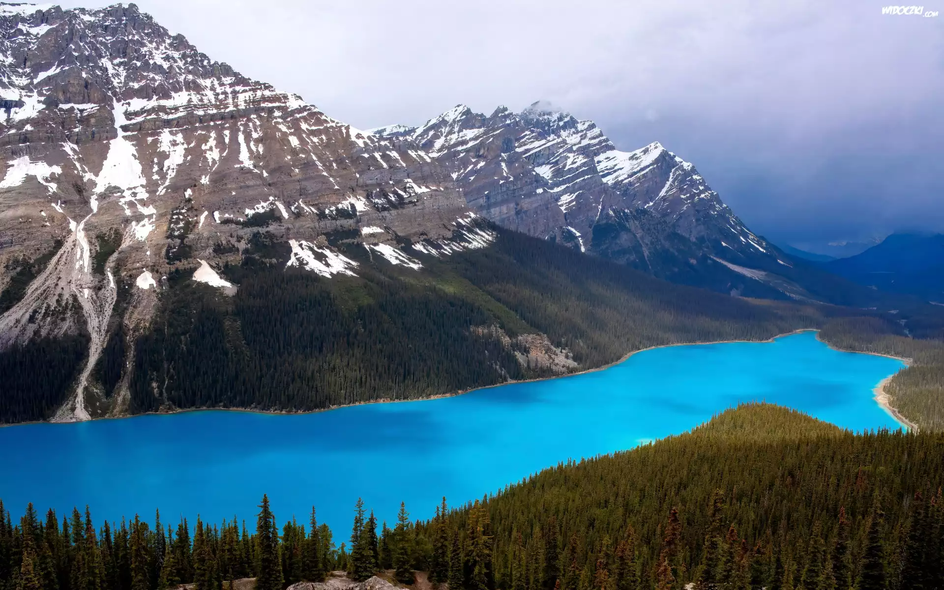 Zdjęcia, Park Narodowy Banff, Jezioro, Peyto Lake, Góry, Chmury, Prowincja Alberta, Kanada