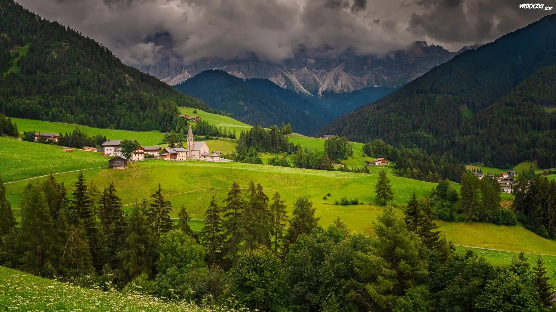 Zdjęcia, Góry, Dolomity, Wieś, Santa Maddalena, Dolina, Val di Funes, Drzewa, Lasy, Domy, Droga, Chmury, Włochy