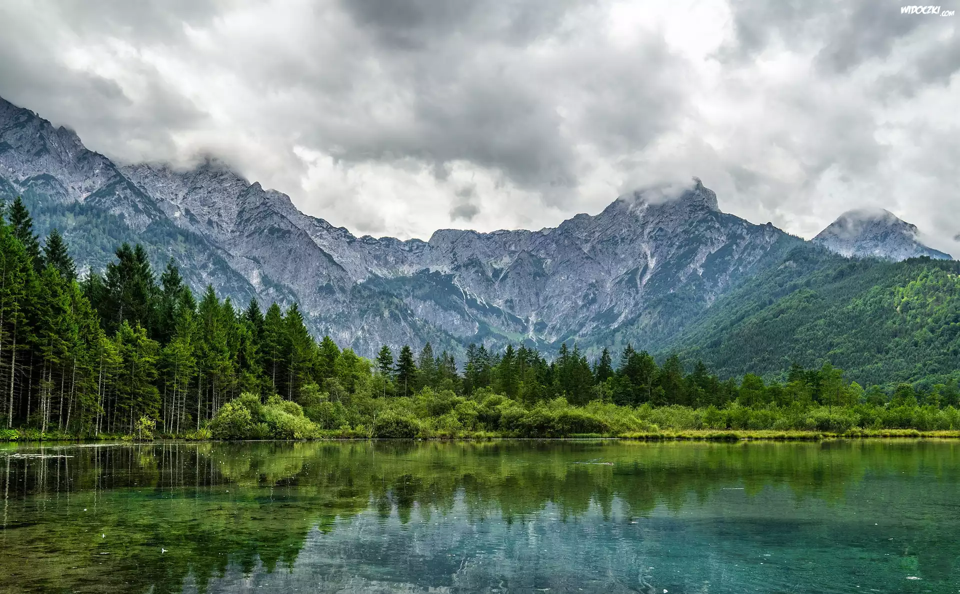 Góry, Las, Drzewa, Jezioro, Chmury, Odbicie