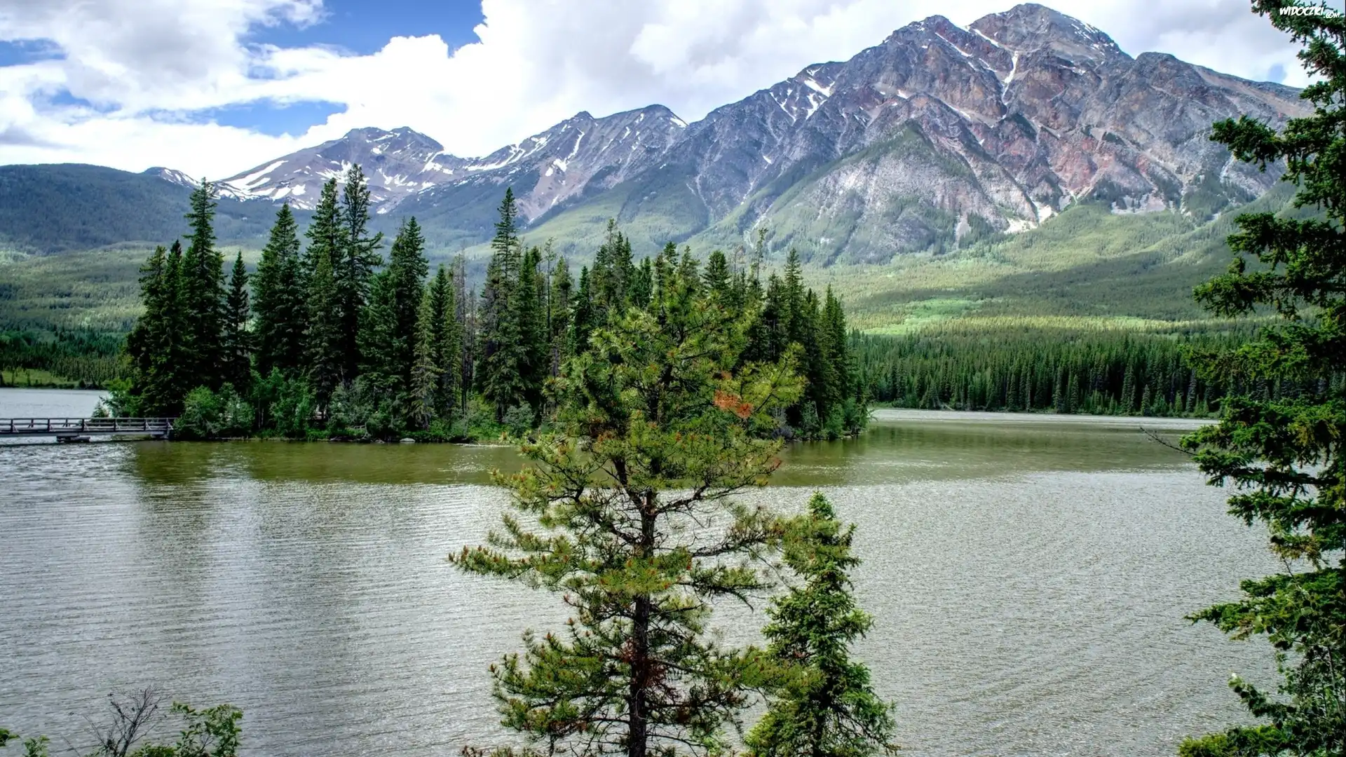 Zdjęcia, Góry, Jezioro, Drzewa, Chmury, Niebo