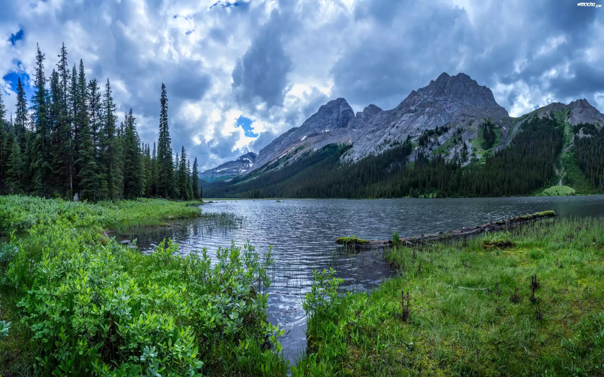 Góry, Jezioro, Drzewa, Chmury, Roślinność