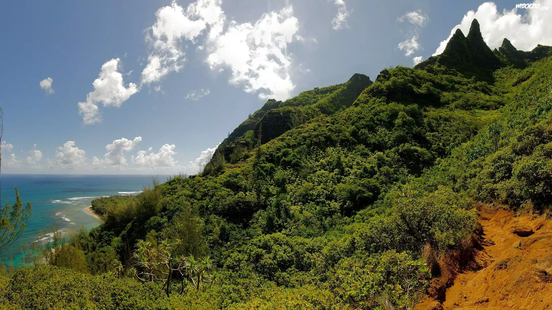 Zdjęcia, Góry, Drzewa, Chmury, Morze