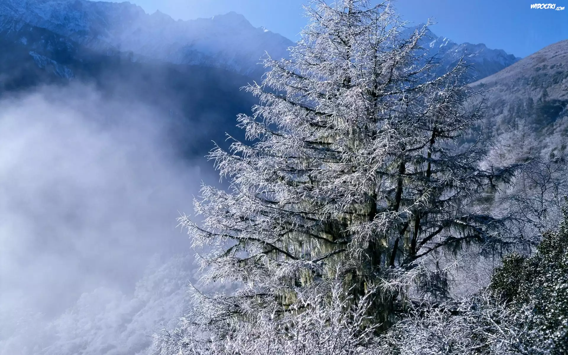 Góry, Drzewa, Chmury, Zima