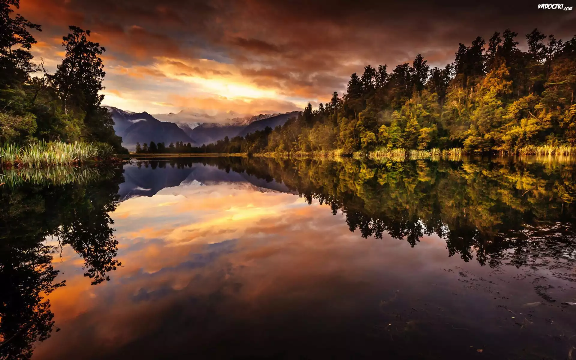 Góry, Drzewa, Jezioro, Chmury, Odbicie