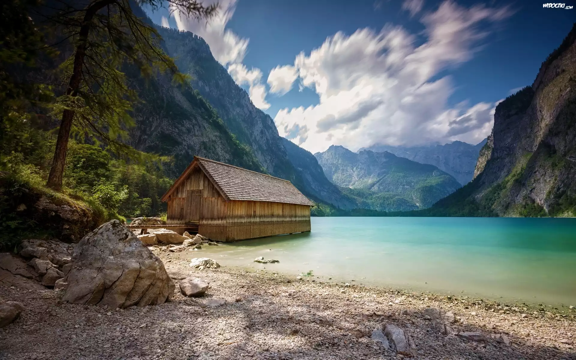 Zdjęcia, Góry, Alpy, Jezioro, Kamienie, Chmury, Domek